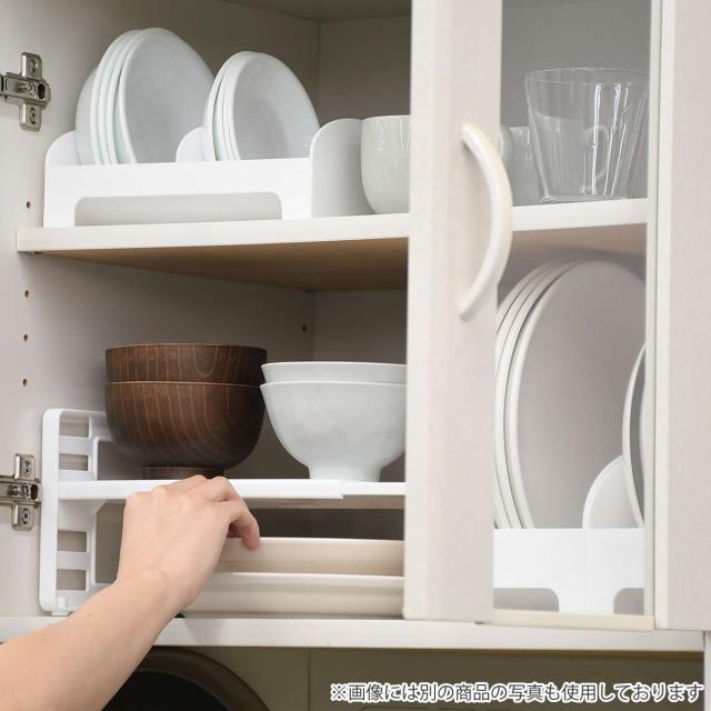 幅約25〜35cmまで調整可能です。空きスペースにぴったりフィットし、食器棚の収納力を効率よく高めます。