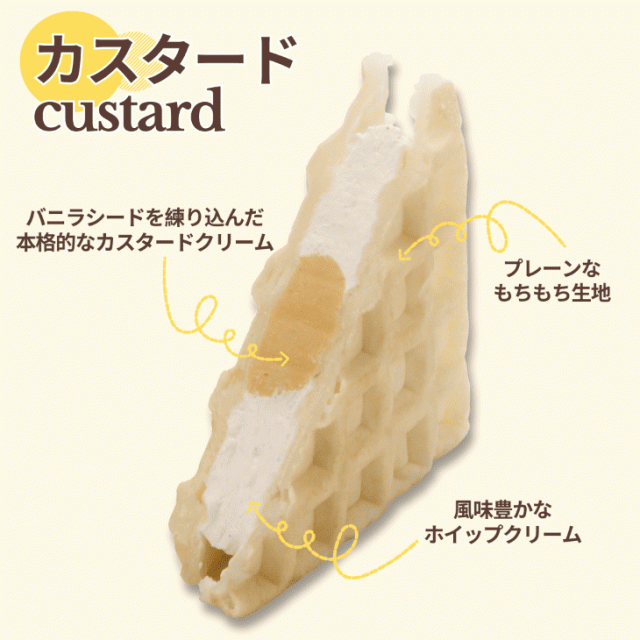 もちもち食感のワッフル生地に、ふんわりとろりとしたホイップクリームとバニラビーンズシードを使用した本格的なカスタードクリームをはさみ、風味豊かな優しい甘さに仕上げました。