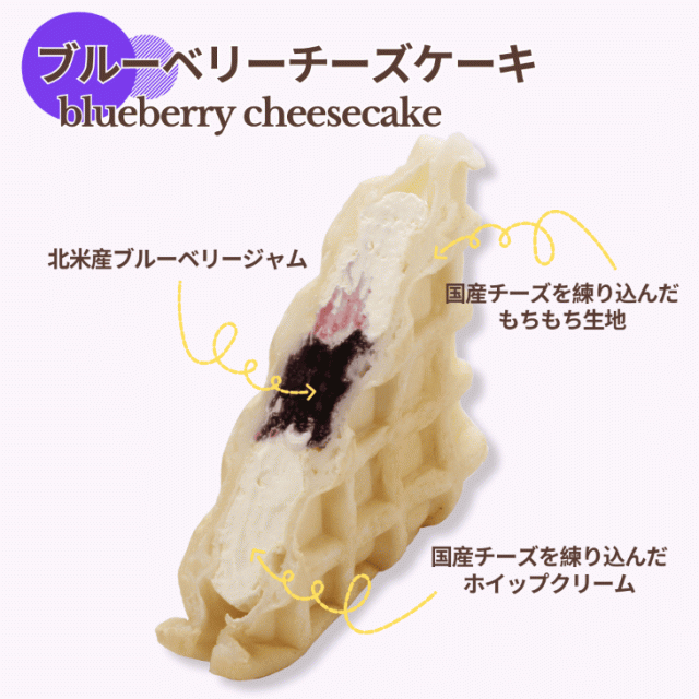 国産チーズを練りこんだ風味豊かなもちもち食感のワッフル生地に、国産チーズを練りこんだホイップクリームを使用しています。ブルーベリージャムの甘みとチーズのほんのりした酸味が好相性の一品です。