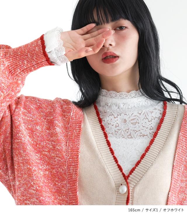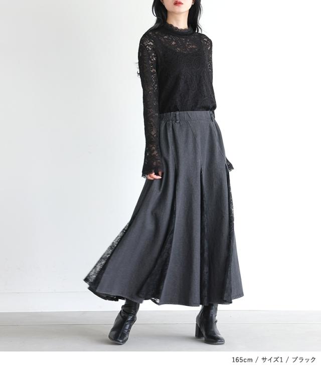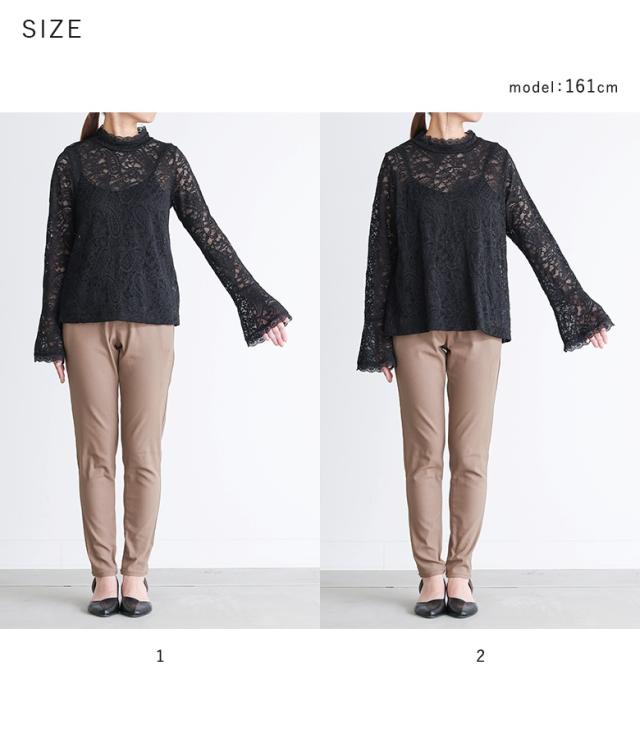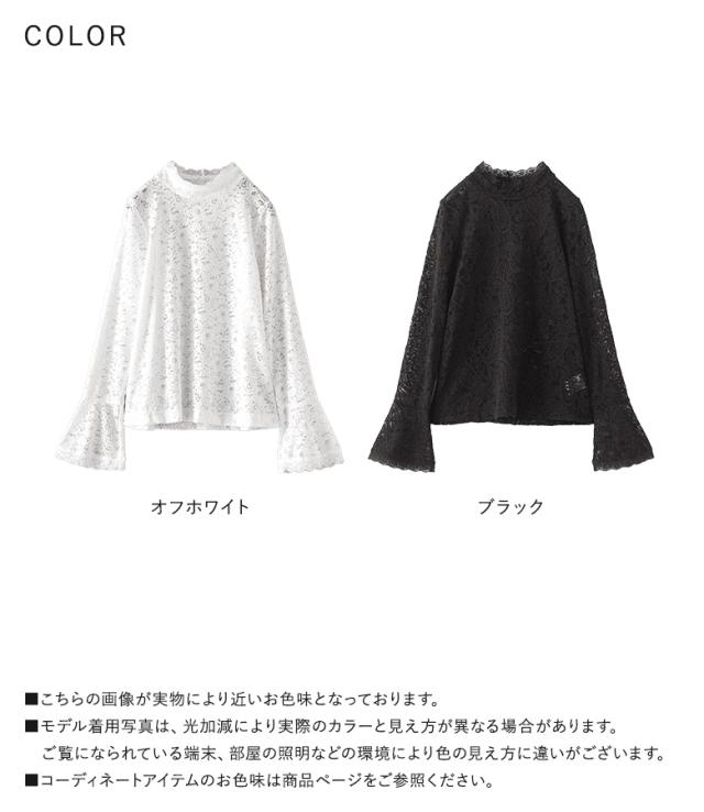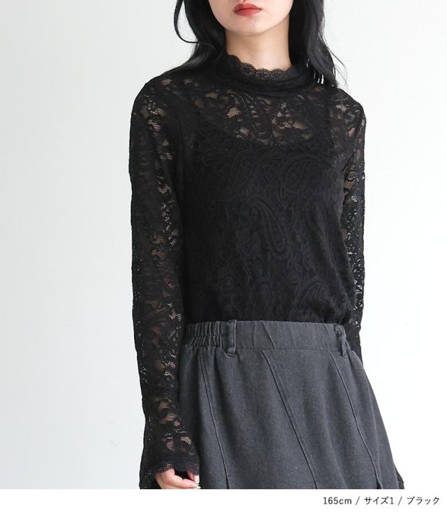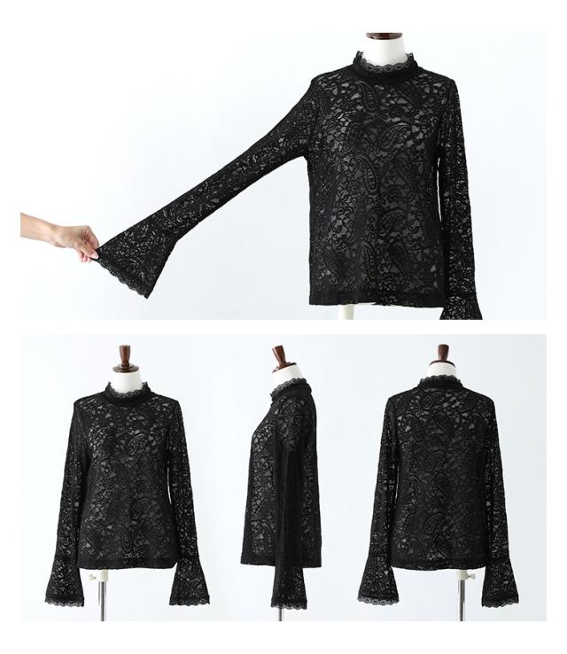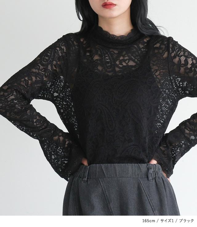 <冬新作>『袖フレアレースカットソー』※メール便可※【10】[レースカットソー 長袖 レディース トップス ロンT インナー ハイネック 袖フレア 伸縮性 花柄 ペイズリー柄 レース 秋 冬 春]