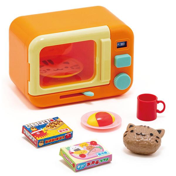 レンジ本体、焼きおにぎり(猫の顔型)、オムライス、チン!するお弁当、チン!する冷凍たこやき、ホットミルク用カップ、お皿