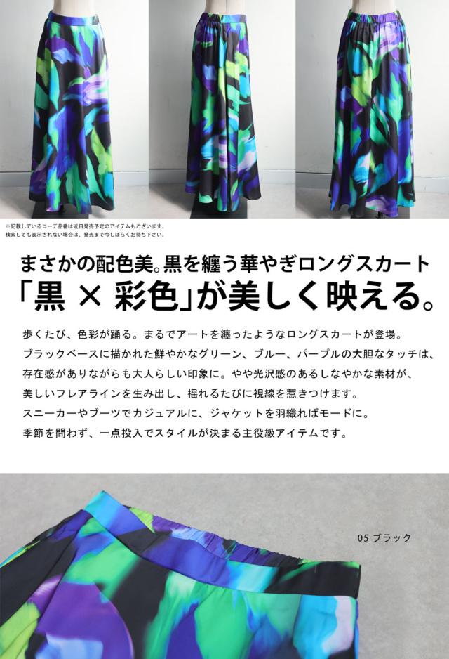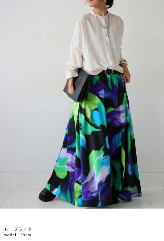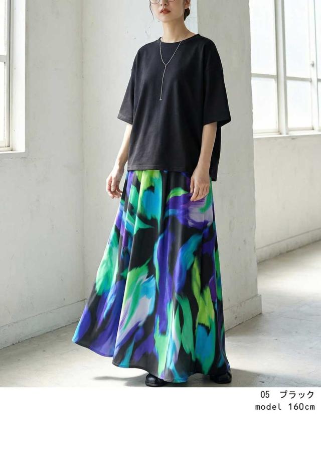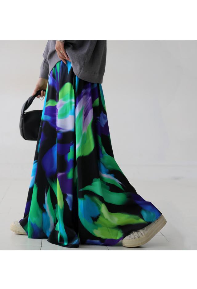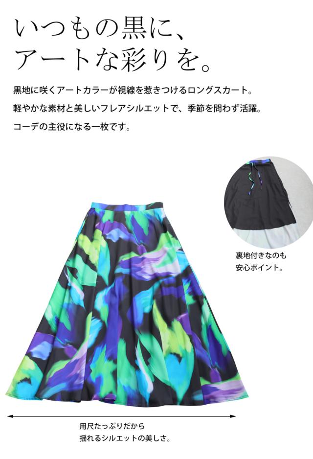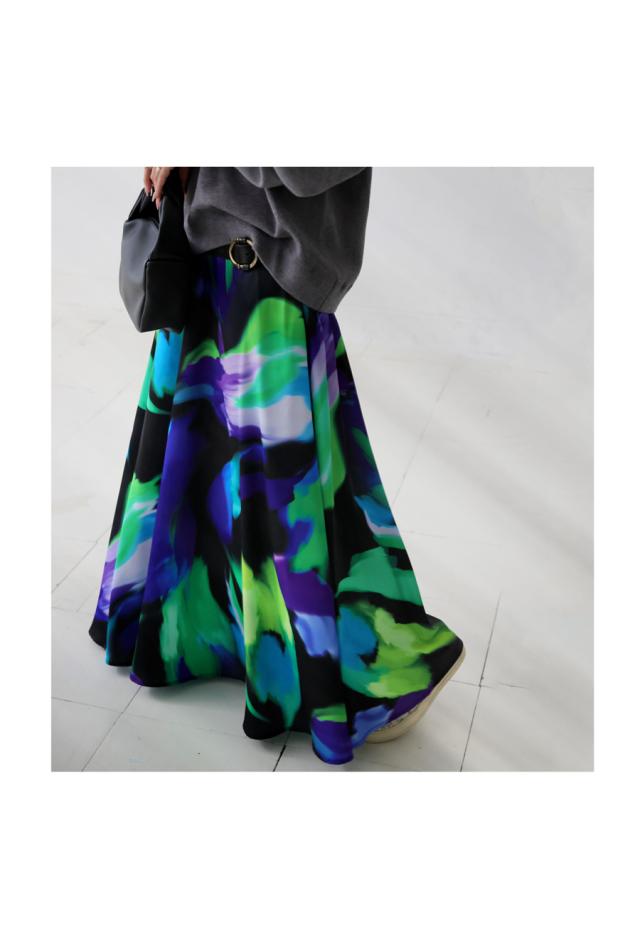 大胆なアート柄が視線を惹きつけるロングスカートです。