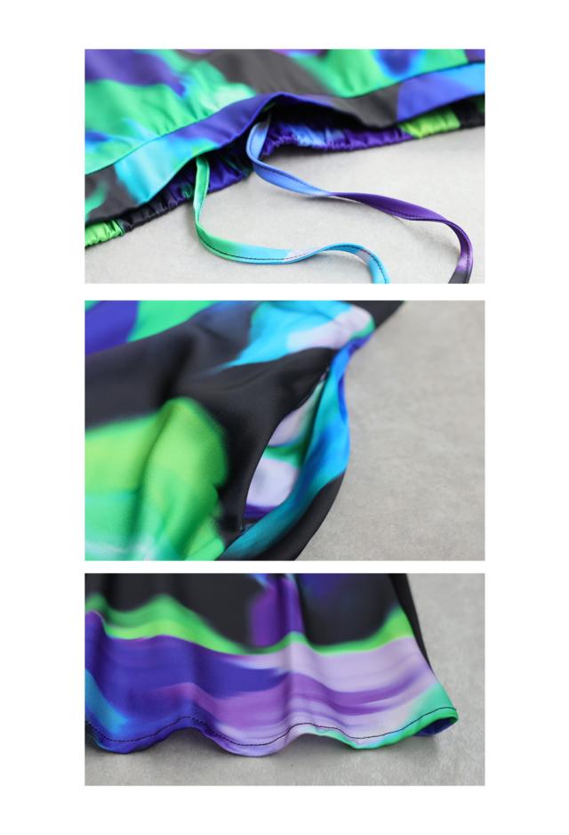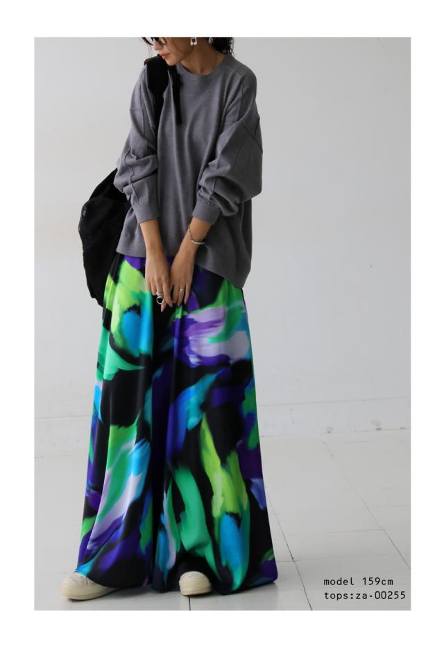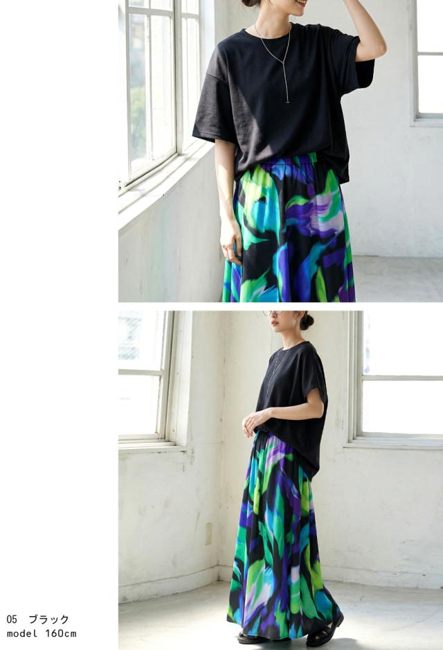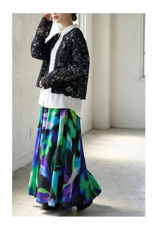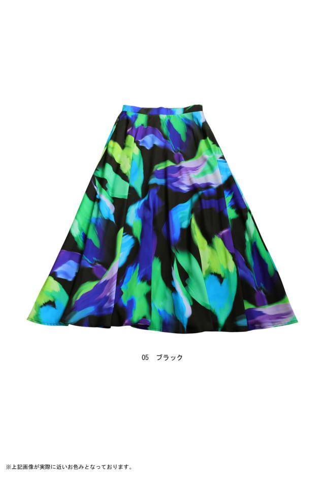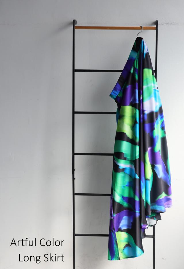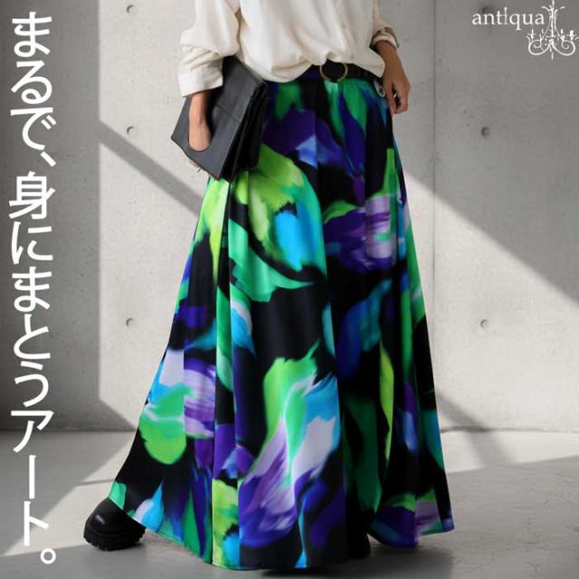大胆なアート柄が視線を惹きつけるロングスカートです。