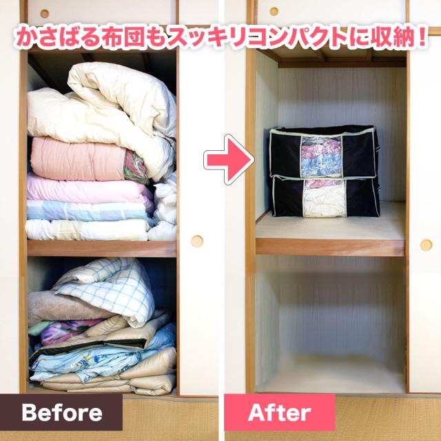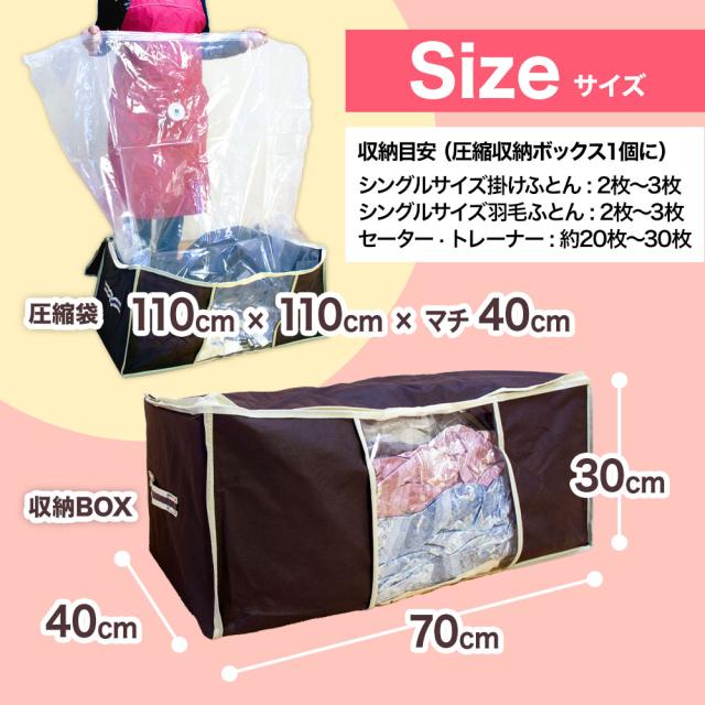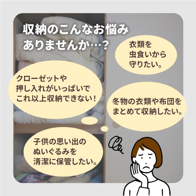 | 詳細 | ●おしゃれな窓付き収納ボックスに圧縮袋が内蔵された大容量かつ見せる収納ボックス!ベッド下のごちゃごちゃや見栄えも解消。 ●収納ボックスは底面、側面に型紙が内蔵されているので、収納物に関係なく形を保ち、横置きで重ねたり、縦置きも可能。 ●長期保管も安心の専用の抗菌防臭防ダニシート付き。 ●布団はもちろん、こたつ布団、座布団、カーペット、厚手の衣類からぬいぐるみなど全部圧縮して押入れを整理整頓。圧縮袋を使って約1/3まで圧縮できるから押入れも収納力アップ。圧縮することで湿気もシャットアウトできるから長期間の保管も心配無用。 |