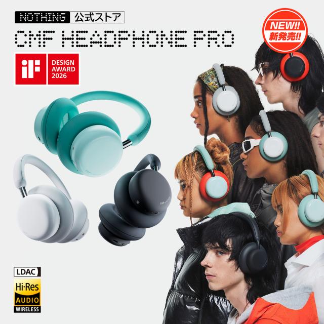 | ブランド |NOTHING 商品名 |CMF Headphone Pro カラー |ダークグレー、ライトグレー、ライトグリーン サイズ・質量 |本体 168.5mm x 95.7mm x 188.5mm(高さx幅x厚さ)、約283g / クッション 96mm x 95.7mm x 30mm、約45g ドライバー |40mm 振動板 | ドーム素材: PEN+PU、コーティング: ニッケルめっき 無線周波数 |20 HZ ? 20 KHZ チューニング |NOTHING バッテリー |再充電式リチウムイオン、720mAh 充電 |100%の充電に必要な時間(USB-Cワイヤード充電 ):120分 高速充電 |ANCをオフにした高速充電:5分で5時間(50%の音量で再生)、ANCをオンにした高速充電:5分で2.4時間(50%の音量で再生) 再生時間 |AAC:ANCをオフにした再生(50%の音量): 最大100時間、ANCをオンにした再生(50%の音量): 最大50時間 | LDAC:ANCをオフにした再生(50%の音量): 最大70時間、ANCをオンにした再生(50%の音量): 最大38時間 通話時間 |ANCをオフにした通話時間: 50時間、ANCをオンにした通話時間: 35時間 ノイズキャンセリング |ハイブリッドANC、強度最大40db、周波数域2,000Hz、環境アダプティブANCアルゴリズム、外音取り込みモード、通話用ENCアーキテクチャを3基のマイクに搭載、風切り音抑制メッシュ マイク |合計5基 接続 | Bluetooth 5.4 コーデック | AAC、SBC、LDAC その他の機能 |GOOGLE FAST PAIR Microsoftクイックペアリング、応答性の高いユーザー体験を生む低レイテンシ、LDACとハイレゾ認証(ワイヤード接続とワイヤレス接続)、LEDによる充電状況表示、オンヘッド検出、低レイテンシーモード 防水防塵 | IPX2 対応OS |iOS 13 以降、Android 5.1 以降をサポート パッケージ内容 |CMF HEADPHONE PRO、キャリーポーチ、ユーザーガイド、安全と製品保証に関する情報、3.5mmオーディオケーブル(1.2M |