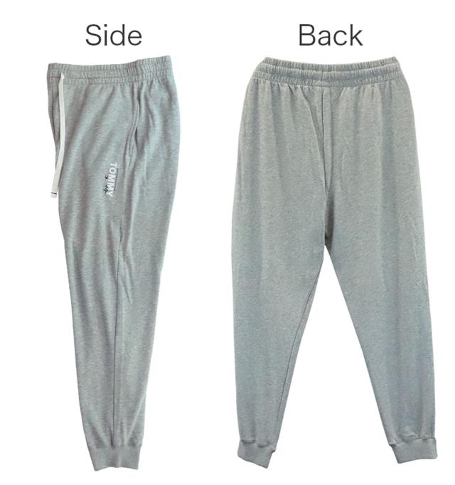ウエストは紐付きのギャザー仕様で、裾はリブ仕上げ、すっきりとしたジョガーシルエットが特徴です。ブランドロゴのプリントがアクセントになったシンプルなデザインで、メンズサイズですが、ユニセックスでも着用いただけます。裏起毛のあたたかさがありながらも薄手でごわつかない、ライトな着心地の一着。