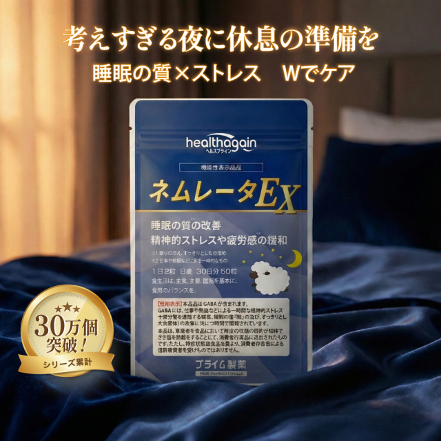 睡眠 ストレス サプリ GABA ラフマ 精神的 ストレス 疲労 感 緩和 ネムレータEX トリプトファン テアニン セントジョーンズワート 睡眠の質 改善 休息 快眠 サポート サプリメント ギャバ ぎゃば 機能性表示食品 プライム製薬 すっきり 目覚め
