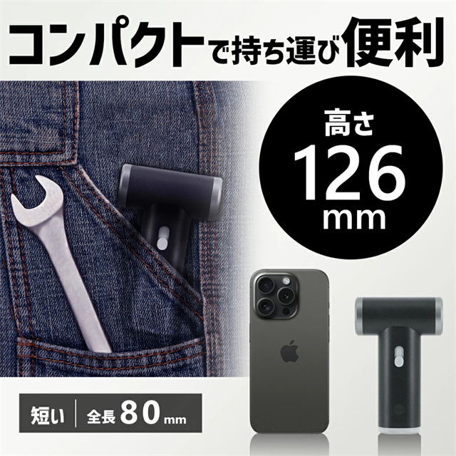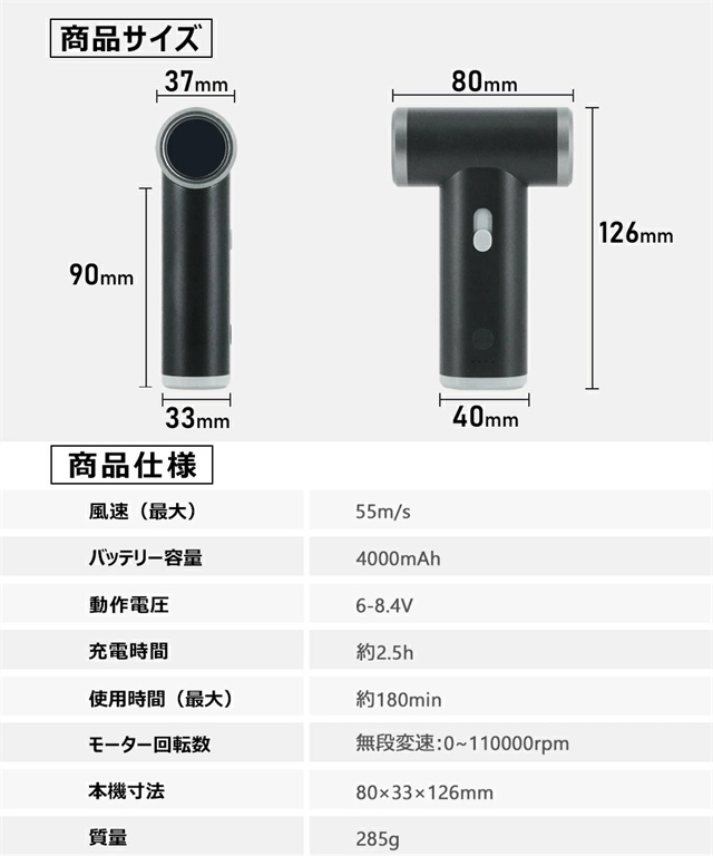 | 仕様 | ◆最大風速 ・55m/s ◆バッテリー容量 ・4000mAh ◆動作電圧 ・DC 6.4-8.4V ◆充電時間 ・約2.5時間 ◆消費電力 ・80w ◆風速調整 ・無段変速 ◆使用可能時間 ・約3時間(一番弱い) ◆ノイズ ・<88db ◆モーター回転数・110,000rpm ◆本機寸法(ノズル除く) ・W:80mm ・D:33mm ・H:126mm ◆質量 ・285g ◆セット内容 ・ エアダスター本体×1 ・ USB(A-C)ケーブル×1 ・ ノズル×7 |
