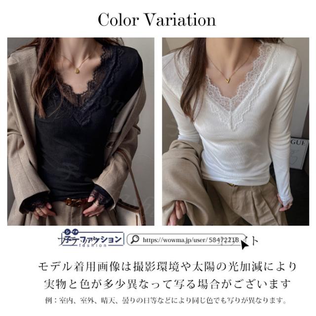 Tシャツ 長袖 長袖tシャツ 冬新作 カットソー Vネック レース リブ ショルダーラインシーム スリム インナー 薄手 細見え レディース トップス 無地 20代 30代 40代 女性 女子 女性用 秋服 春秋