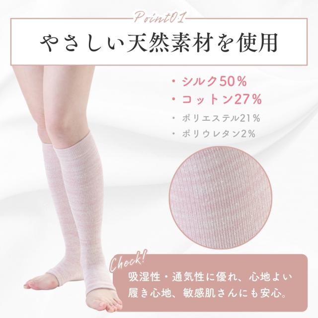 くつした 指なし 日本製 着圧ソックス シルク コットン オープントゥ おやすみ靴下 足先なし つま先 無し ひざ下 段階着圧 むくみ 冷え取り 寝る時 つま先なし おやすみ おやすみソックス 絹 綿 靴下 指なし 飛行機 機内 エコノミー 移動 移動時 長距離移動 おしゃれ 単品 セット 立ち仕事 寝るとき用 寝ながら 膝下 ふくらはぎ フライト 夜用 春 夏 秋 冬 オールシーズン 旅行 災害時 通気性 段階式着圧 薄手 薄い 絹 吸汗速乾 吸湿 放湿 締め付けない 冷え取り 冷房対策 蒸れない メンズ レディース 男女兼用 ユニセックス 女性 女性用 プレゼント クリスマス さらさら 肌触り すべすべ スムース インナー 汗取り 日ノ出絹織 mariiclub