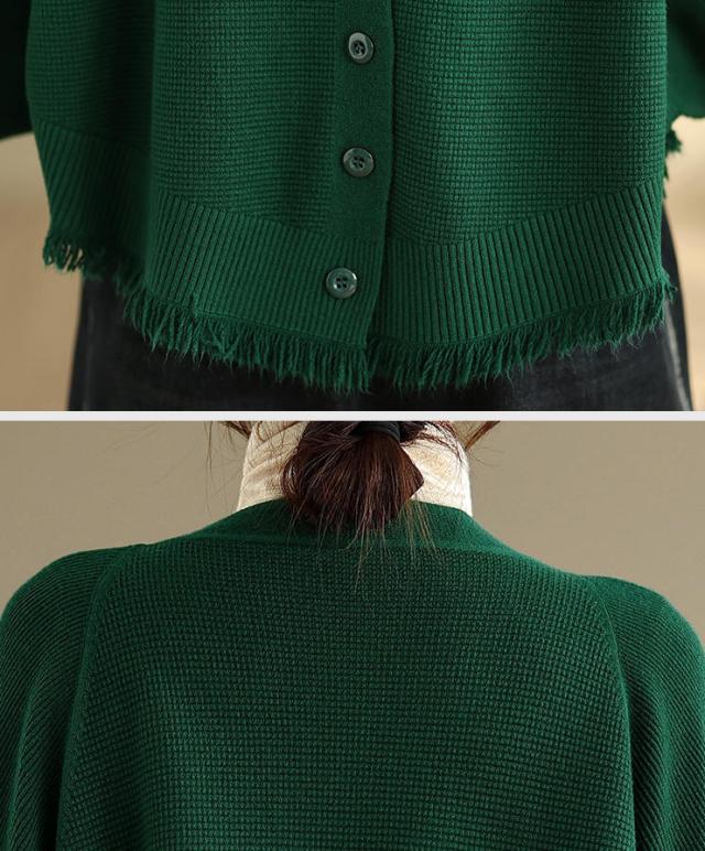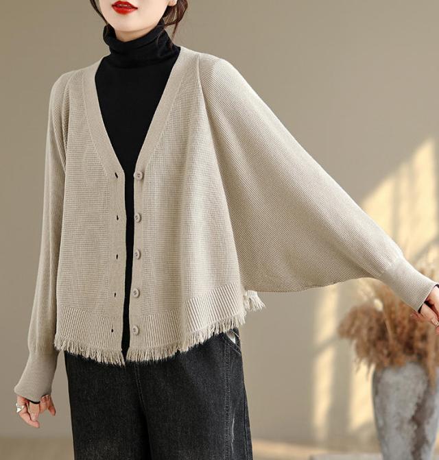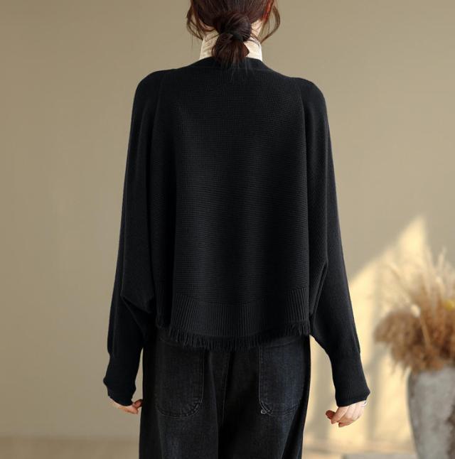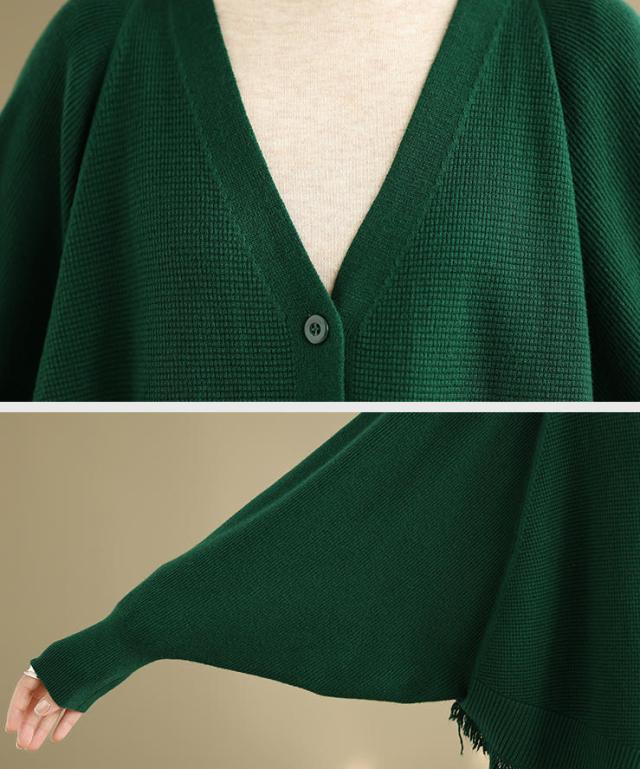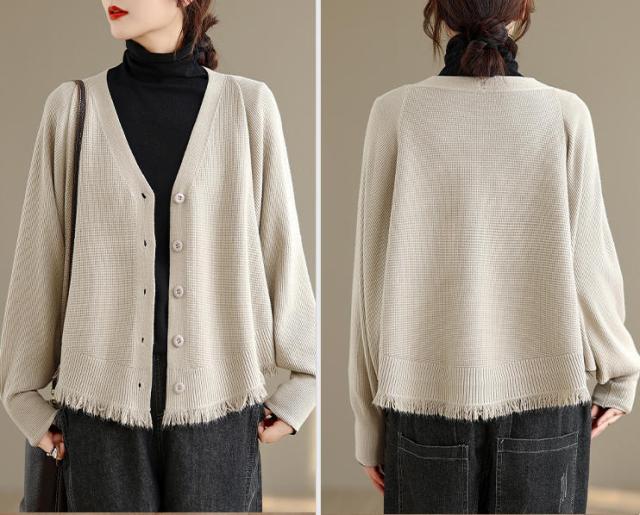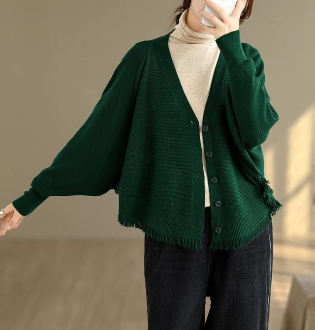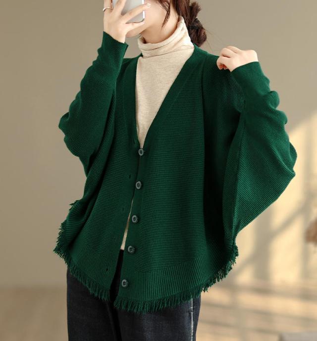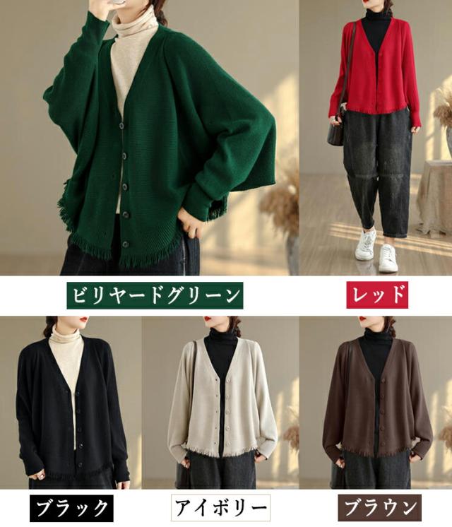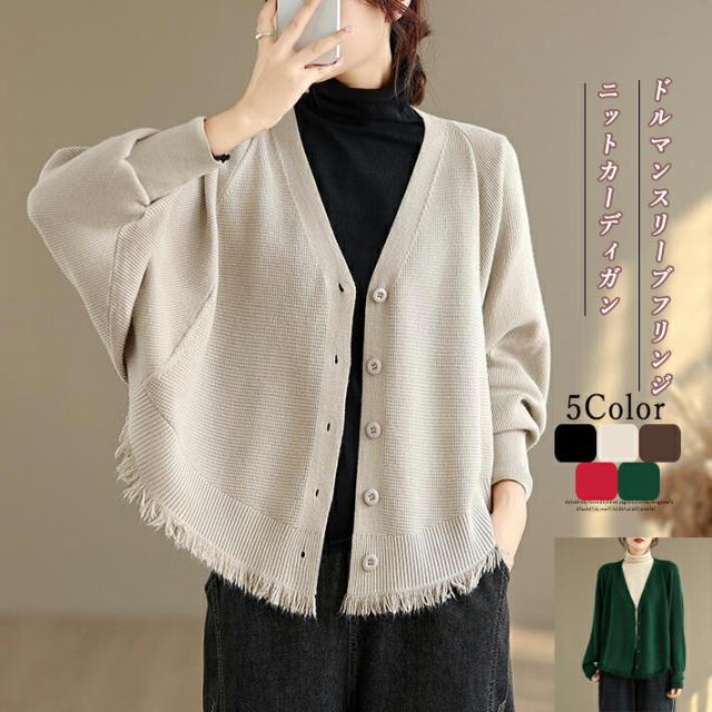 カーディガン ニット レディース ドルマンスリーブ 裾フリンジ 羽織 アウター ショート Vネック 袖口リブ 前ボタン 大きめ ゆったり リラックス 可愛い お洒落 春 夏 秋