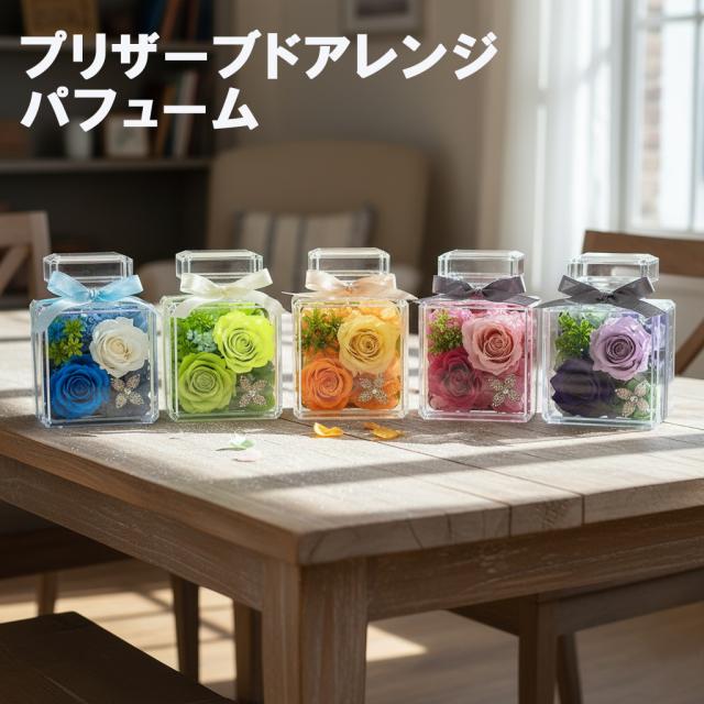 プリザーブドアレンジ・パフュームは、香水のようなボトル型ケースに入った可愛らしいプリザーブドフラワーです。全5色から選べるので、お部屋の雰囲気や贈る相手にぴったりの色が見つかります。お祝い事からお供えまで、幅広い用途で活躍します。お手入れ不要で、いつまでも美しい姿を楽しめるのが嬉しいポイント。小さくて可愛いデザインは、贈り物としても喜ばれること間違いなしです!