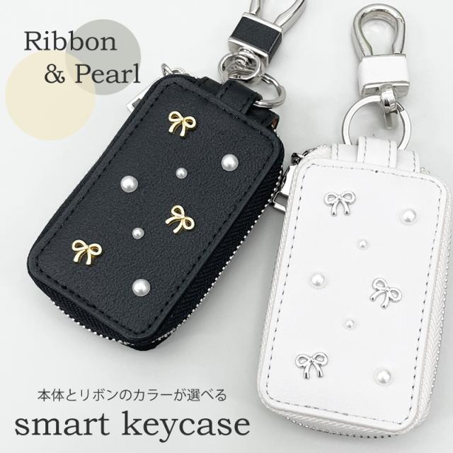 デコ スマートキーケース リボン パール キーケース 鍵 キーカバー 車 収納 ブラック ライトグレー レディース かわいい 送料無料