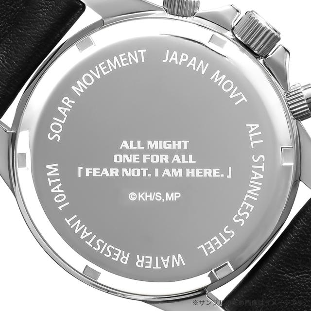 裏蓋には名セリフ「もう大丈夫、私が来た」を英訳した “FEAR NOT. I AM HERE.” を刻印し、12時位置には雄英高校の校章「U.A.ロゴ」をあしらうなど、細部にまで作品の世界観を表現しています。