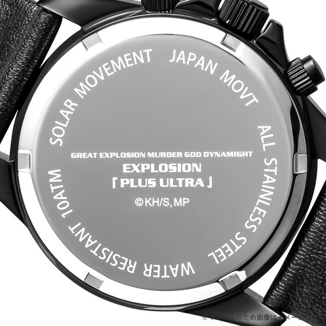 裏蓋には爆豪のヒーローネームと“個性”を表す “EXPLOSION”、さらに校訓である “Plus Ultra” を刻印。12時位置には雄英高校の校章「U.A.ロゴ」をあしらい、細部まで世界観を表現しています。