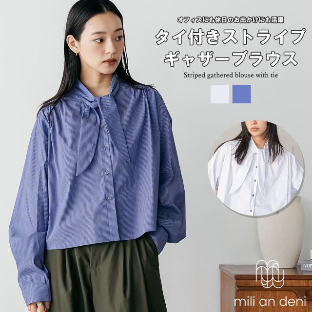 春新作 タイ付きストライプギャザーブラウス ボウタイ付き ショート丈 ストライプ M トップス 春夏 レディース ミリアンデニ メール便(郵2) t61116
