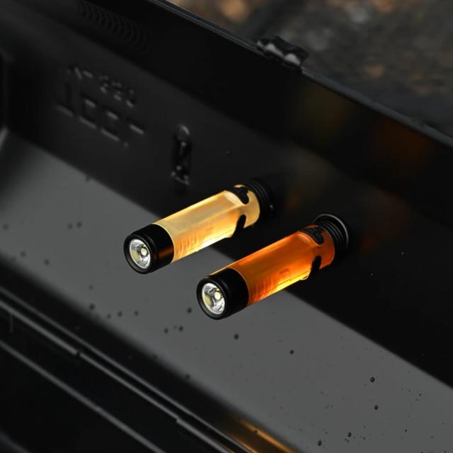 前部と側面ともに点灯でき、ボタン二度押しでモード切替。