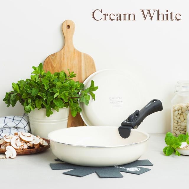 クリームホワイト セラミックコーティングだからできる明るいカラーリングはキッチンを華やかにします。調理中の食材の変化やソースの色みの変化が分かりやすいのも嬉しいポイント。