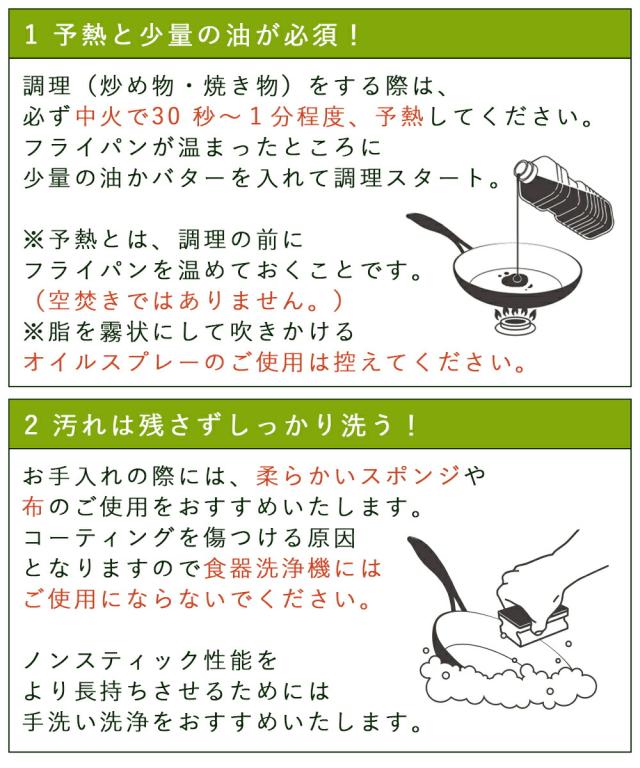 | グリーンパン使いこなしのコツ 最適な火加減でご使用の上、正しいお手入れをしていただくことで、性能を十分に引き出し、長く・快適にご愛用いただくことができます。 はじめてご使用になる前に 〇梱包資材やラベルなどは全て取り除いてください。 使い方のポイント