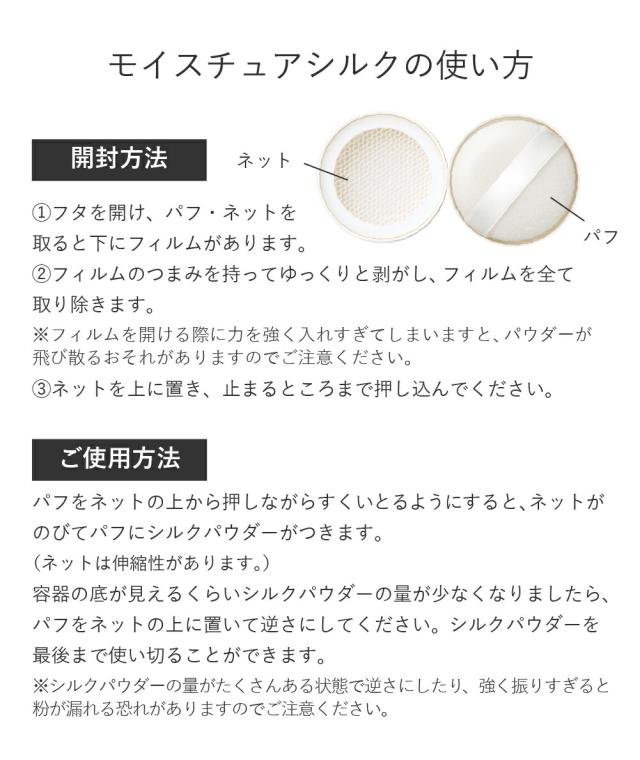 | Point 01 天然シルク100%で、うるおいと軽やかさを両立 朝はキメを整えるメイク下地として、また、メイクの仕上げとして使うと余分な皮脂を吸収し、シルク特有の軽やかさで肌をふんわりと包み込むような仕上がりに。 | Point 02 天然シルクのやさしいヴェールで肌を守る 蚕を包む繭から生まれた天然シルクが、紫外線や花粉、ほこりなど外的刺激から肌をやさしく守ります。 | Point 03 18種類*のアミノ酸で、角質層に働きかける保湿力 シルクは肌の天然保湿因子に近いアミノ酸組成を持つため、肌や空気中の水分をキャッチして角質層までしっかり保湿。最初はサラサラ、時間が経つほどしっとりもちもちに。 * トリプトファン、フェニルアラニン、ロイシン、バリン、イソロイシン、スレオニン、メチオニン、リジン、ヒスチジン、プロリン、グリシン、アラニン、アルギニン、グルタミン酸、シスチン、アスバラギン酸、セリン、チロシン| Point 04 ふんわりやわらかなフォギー肌へ シルクに含まれるアミノ酸は人の肌と非常に近い組成を持っているため、驚くほどなじみやすく、肌に優しく溶け込むようにフィット。まるで肌そのものをケアしているかのような自然な使用感を感じられます。 | ご使用方法