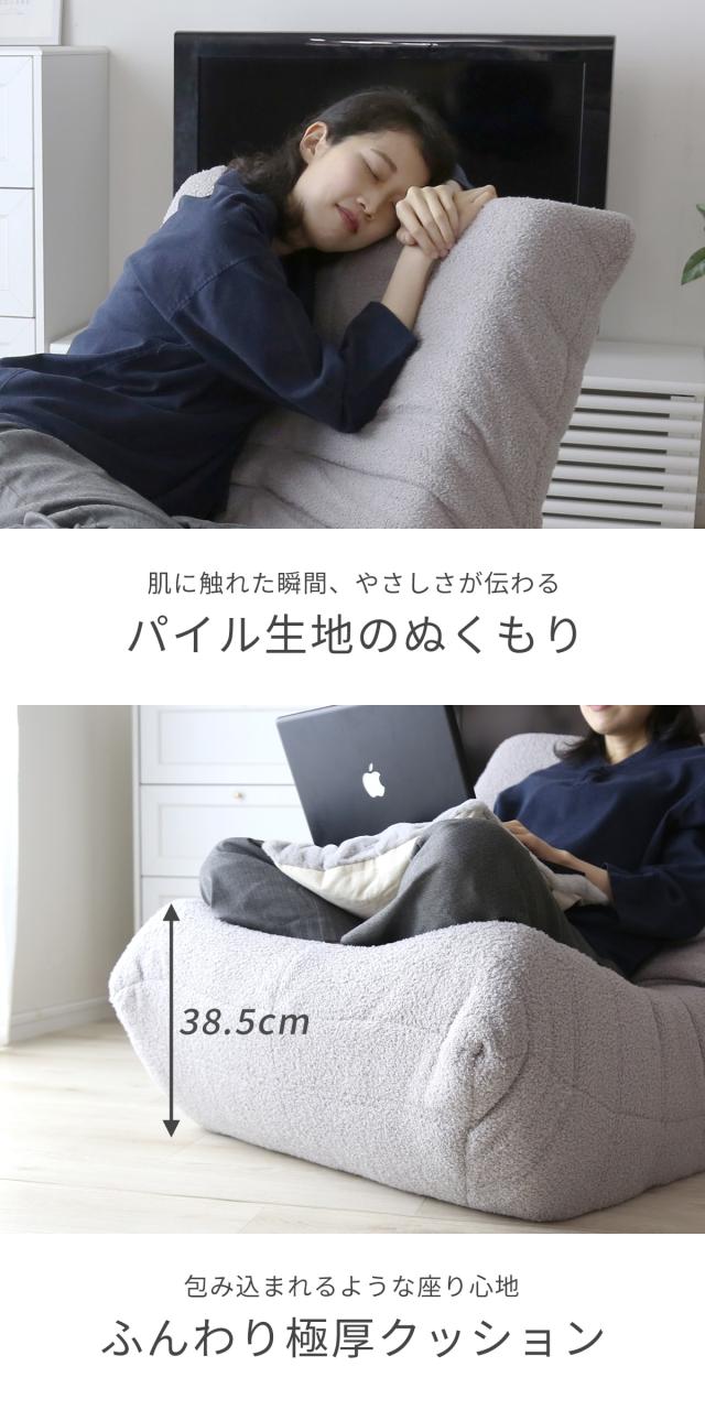 肌触りの良いパイル生地が、やさしく身体を包み込み、まるで毛布にくるまれているような心地よさを実現。さらに、しっかりと厚みのあるクッションが体圧を分散し、長時間でも快適な座り心地をキープ。リラックスタイムに最適です。