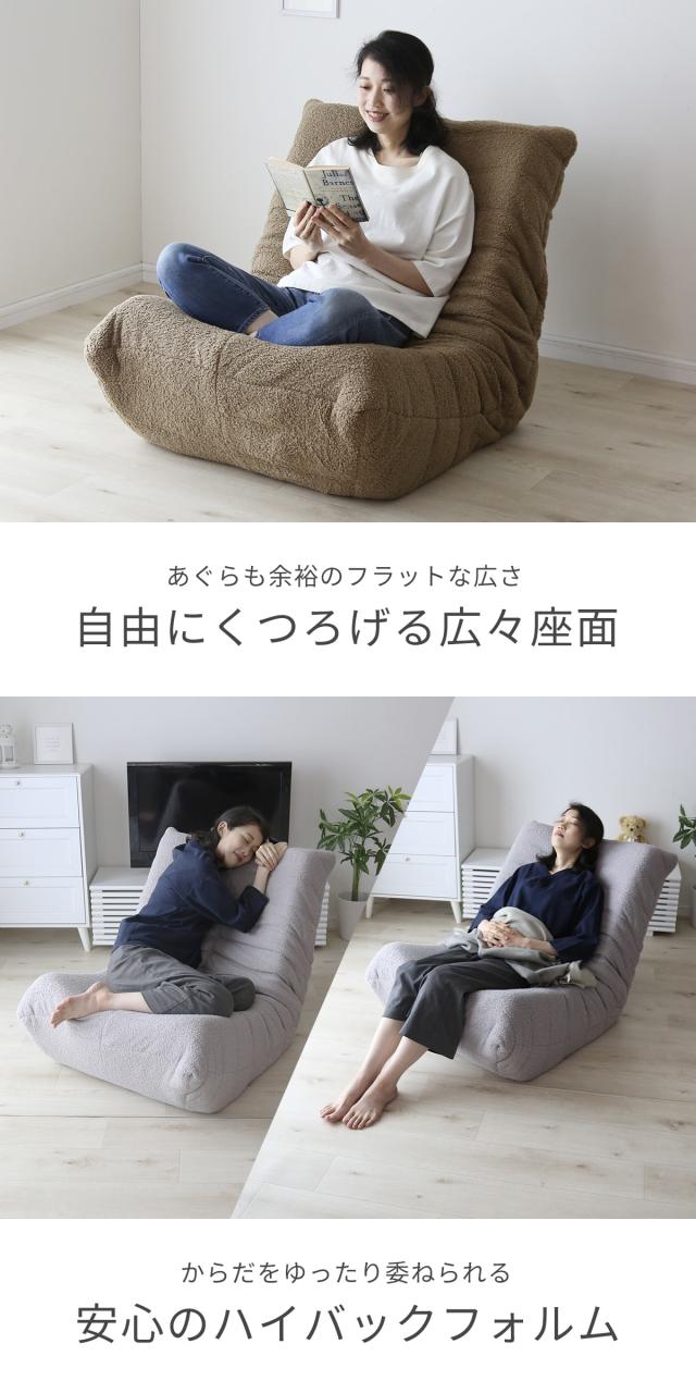 あぐらも楽にかける広めの座面で、ゆったりとしたリラックス姿勢が可能。背中をしっかり支えるハイバック仕様で、頭まで体全体をあずけられる安心感があります。長時間の使用でも快適に過ごせます。