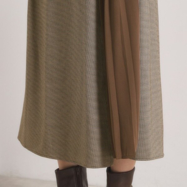 異素材の配色使いがポイントで、濃色の無地生地が縦のラインを強調する事でボリュームのあるシルエットでもすっきりと見せてくれます。