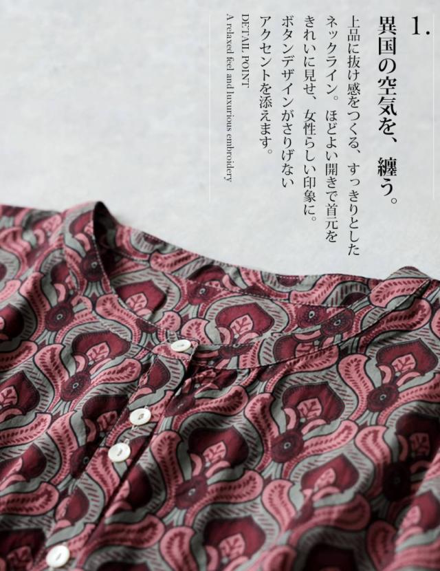 iya-00151 バンドカラー ハーフボタン ロング丈 綿100 柄ワンピ ロング ゆったり 体型カバー ワイドシルエット リラックス ワンピ ナチュラル エスニック アジアンテイスト コットン