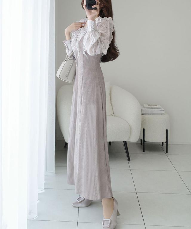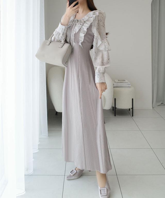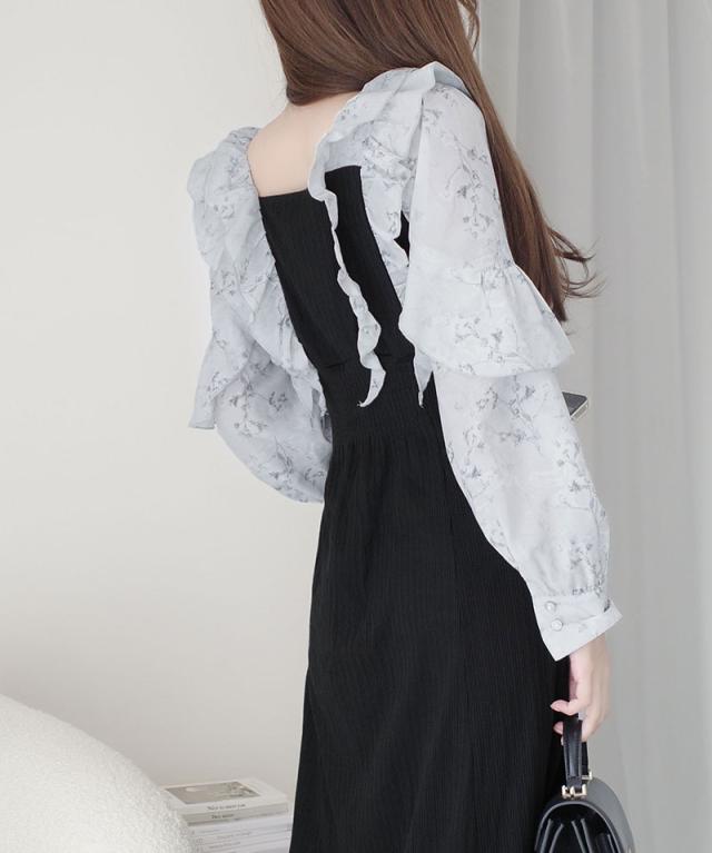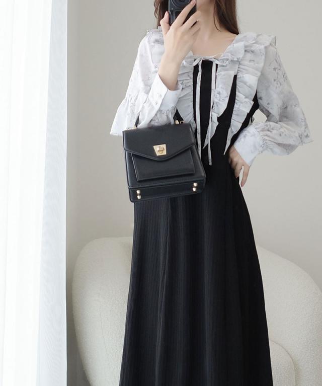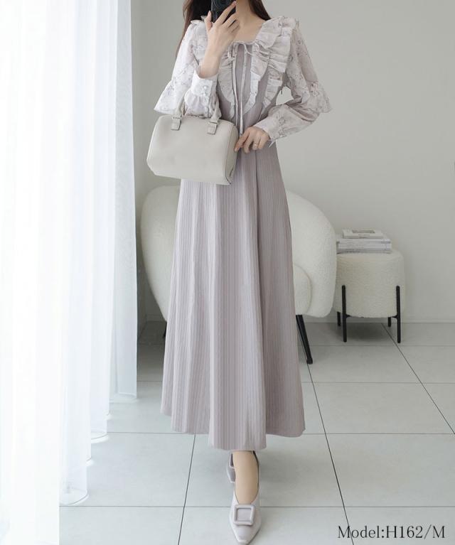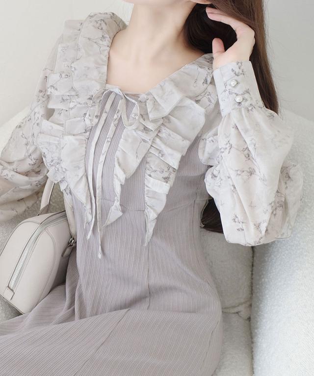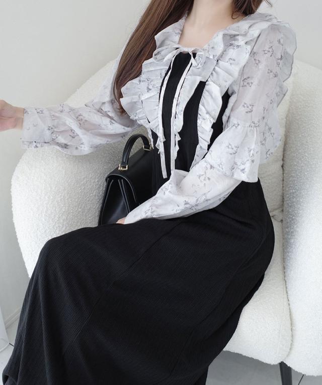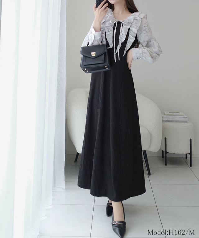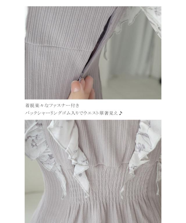 クラシカルエルフ秋新作 mily bilet ワンピース 秋 レディース きれいめ シャイニー花柄 フリル ブラウス ドッキングワンピース 異素材 切り替えデザイン Aラインシルエット 華奢見え効果 ふんわり 可愛らしい リボン 大きいサイズ 2025aw mi1139093