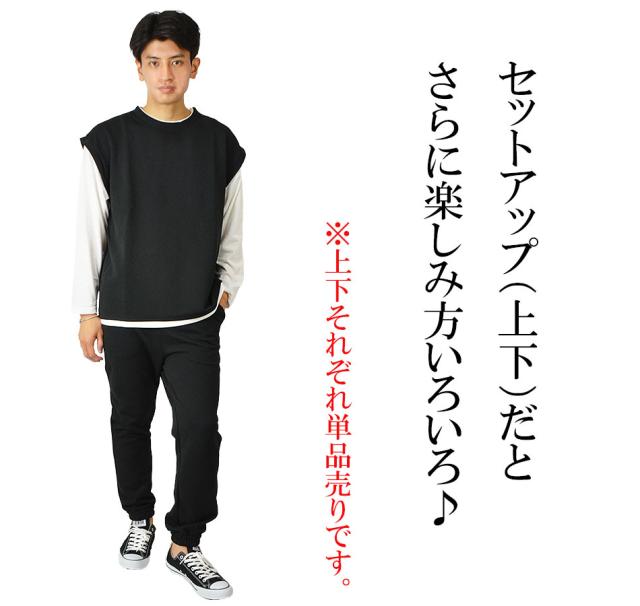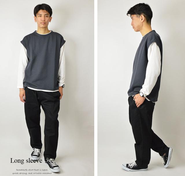 ■白いロンTにおしゃれなBIGベストを重ね着しているように見えるが、フェイクなので着膨れする事なく、スッキリしたスタイルに魅せてくれる優れたファッションです。