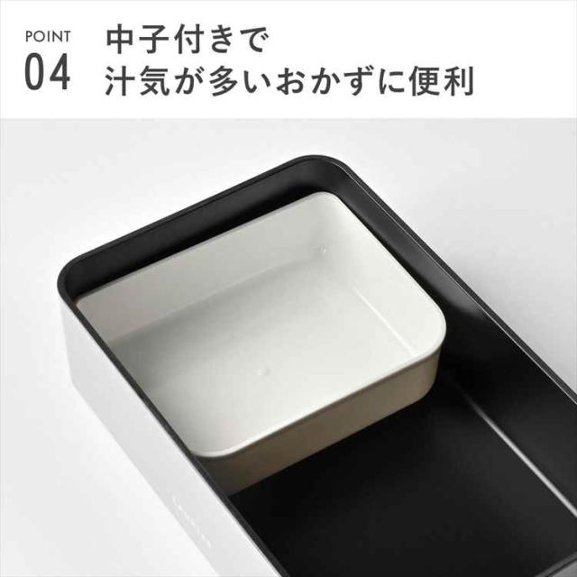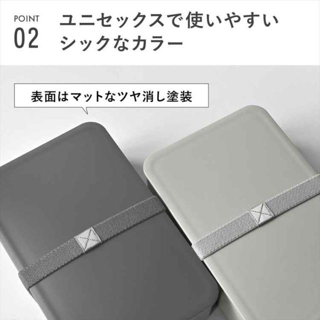 容量800mlとたくさん入るので男性にもおすすめのサイズ。内塗りは黒の塗装でシックな印象。蓋をしたまま電子レンジでの温めができ、食器洗い乾燥機の使用も可能です。蓋には汁漏れしにくいシリコーンゴムのパッキンが付いています。付属のランチバンドはそれぞれのお弁当箱に合う色で組み合わせました。
