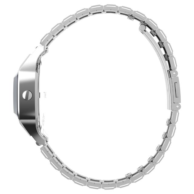 オリジナルを踏襲した近未来的なケースシェイプと、ネイビーレンズ越しに浮かび上がるデジタル表示が特徴。シルバーカラーのメタルブレスレットと一体感のあるフォルムが、1970年代らしいレトロモダンな雰囲気を演出します。