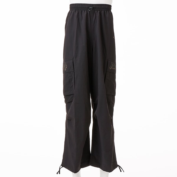 PUMAとRIPNDIPのコラボレーションから、ストリート感あふれるカーゴパンツが登場。オーバーサイズのシルエットに、バンジーコード付きウエストで快適なフィット感を実現。カーゴポケットやサイドポケットなど機能性も充実し、100%リサイクル素材(装飾除く)を使用した、環境にも配慮された一着です。フロントと背面にはコラボロゴをあしらい、個性をしっかり主張します。