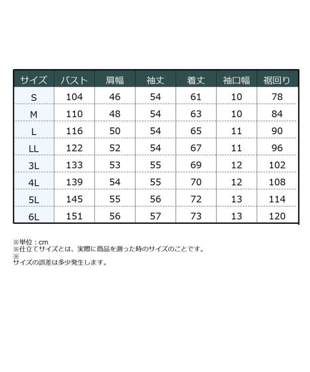 品質=[本体]ポリエステル100% [衿リブ部]ポリエステル94%・ポリウレタン6% [袖口・裾リブ部]ポリエステル85%・ポリウレタン15% 柄の出方が多少異なる場合があります。 透け感:なし 伸縮性:あり 生地の厚み:普通 光沢感:なし 裏地:なし ポケット:なし 季節:春・冬 シルエット:普通 原産国:中国製 備考:洗濯機OK ネット使用 ※単位:cm ※仕立てサイズとは、実際に商品を測った時のサイズのことです。 ※サイズの誤差は多少発生します。