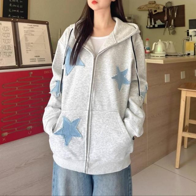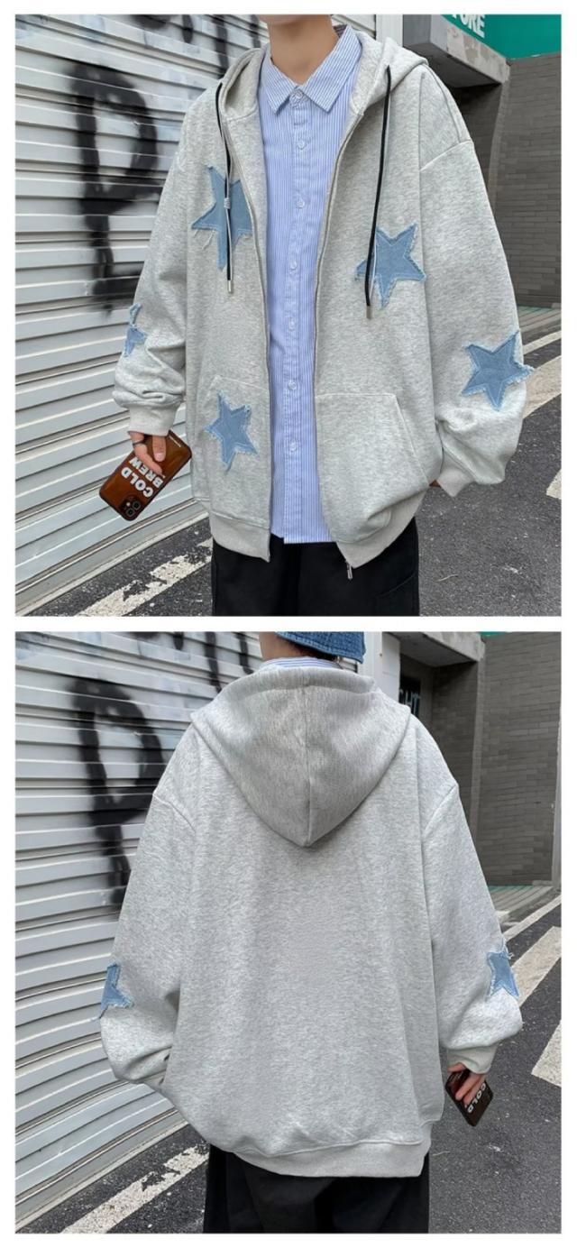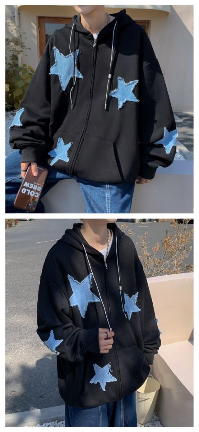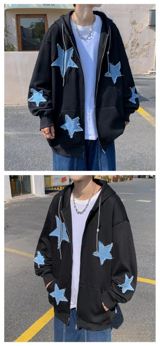星柄 ジップアップパーカー フード付き メンズ レディース トップス カップル 秋 スター柄 ゆったり 羽織り カジュアル シンプル 韓国ファッション