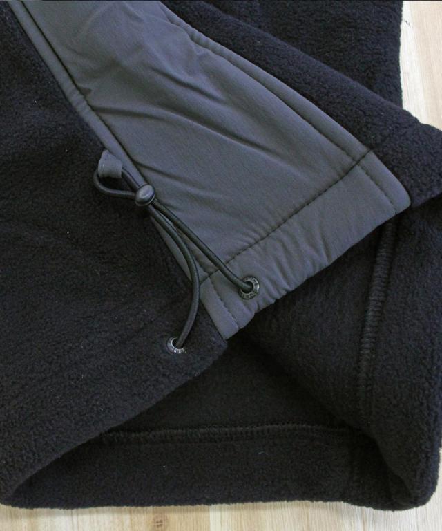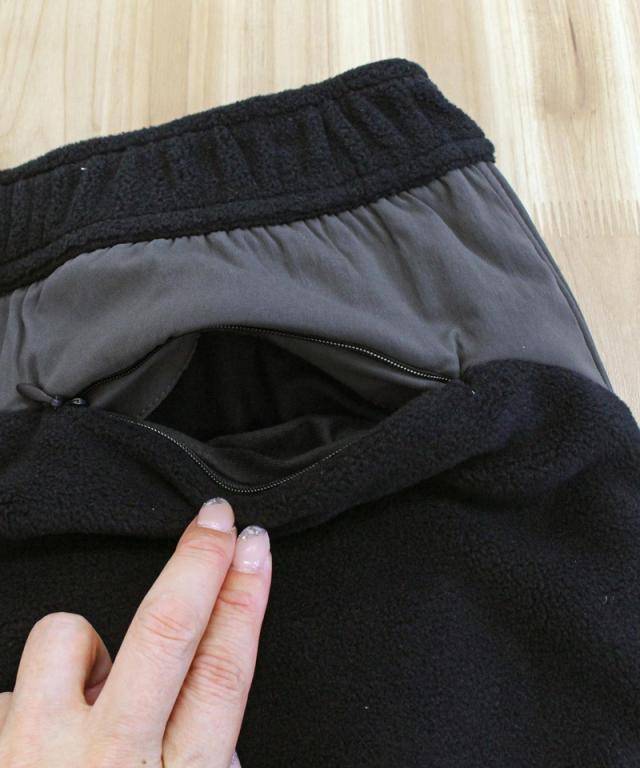 ファスナーポケットを採用、裾はストリングとストッパーでサイズ調節。
