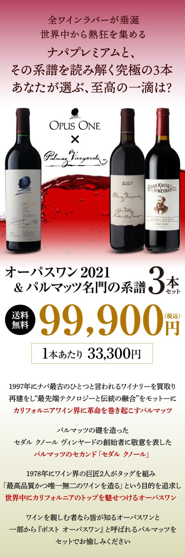 1本あたり33,300円(税込) 送料無料 ナパの2大プレミアム赤 オーパスワン 2021&パルマッツ 2019&パルマッツセカンド 3本セット 浜運