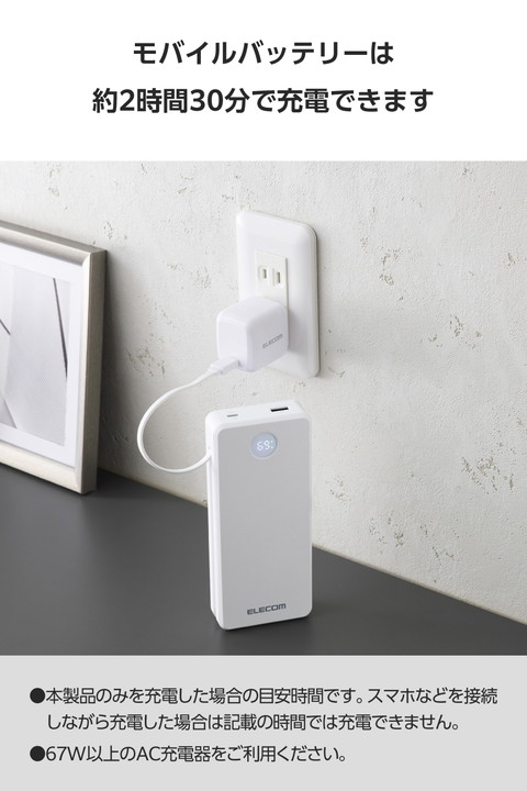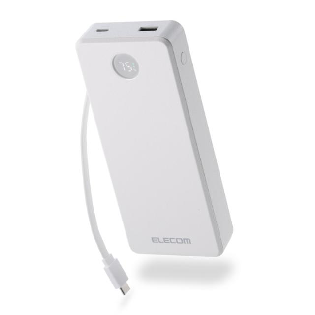 エレコム モバイルバッテリー 残量が見える ケーブル一体型 モバイルバッテリー 20000mAh 67W Type-C ケーブル一体型 リチウムイオン電池 残量表示 ホワイト ┃DE-C77-20000WH