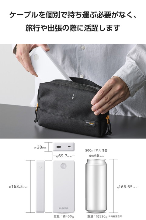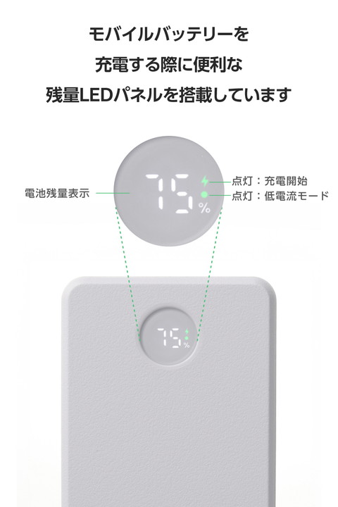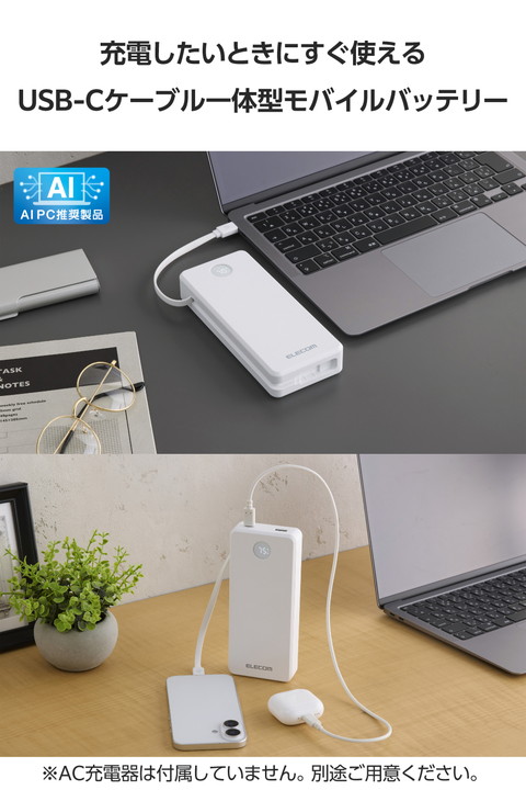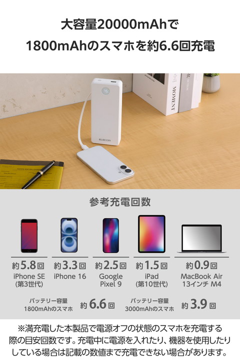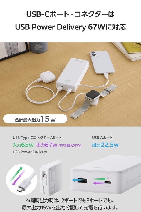 外出先でノートパソコンも充電できる。最大出力67Wでさまざまな機器の充電が可能な、20000mAhのケーブル一体型モバイルバッテリーです。LEDパネルでバッテリー残量を1%単位で確認しながら使えます。![]() ■USB Type-C(TM)ケーブル一体型・20000mAh容量のモバイルバッテリーです。 ■バッテリー・ケーブル一体型なので、ケーブルの持ち運びが不要。旅行や出張の際に活躍します。 ■USB Power Deliveryの67W出力が可能。スマートフォンやタブレットはもちろん、Macbook Airなどのノートパソコンも充電できます。外出先での急な充電切れの際も安心です。 ■※一体型USB Type-CケーブルまたはUSB Type-Cポートからの単独出力の場合に限ります。 ■※67W以下のUSB Type-C入力に対応したパソコンに限ります。また、タブレットやパソコンの充電は1台のみに対応しています。複数の機器を同時に充電する場合は充電できないか、充電に時間がかかる場合があります。 ■USB Type-C一体型ケーブルに加え、USB Type-Cポート×1とUSB-Aポート×1を搭載しています。 ■複数の機器を同時に充電する場合は、1ポート/1ケーブルあたりの出力が低下するため、ご使用の機器によっては充電できない場合があります。 ■※同時出力時は、2ポートでも3ポートでも、合計最大出力15Wを分配して充電を行います。 ■本体充電用ケーブルを接続したままで、スマートフォンとモバイルバッテリーを充電できる“まとめて充電”に対応しています。 ■※本製品はパススルー充電に対応しており、バッテリーを介さずに充電器から接続機器へ直接充電するため、電池の劣化を抑えられます。 ■低電流モードによりBluetooth(R)ヘッドセット・イヤホンなどの小型電子機器を最適な電流で充電できます。 ■※USB-Aポートのみ対応します。 ■接続機器を見分けて最適な充電を行う“おまかせ充電”に対応しています。 ■※USB-Aポートのみ対応します。 ■USB Power Deliveryの機能の一つであるPPS(Programmable Power Supply)規格に対応しています。 0.02V刻みで細かく自動で電圧調整されるので、機器に合った最適な充電が可能です。 ■本製品(バッテリー容量20000mAh)で、1800mAhのスマートフォンを約6.6回、3000mAhのスマートフォンを約3.9回充電可能です。 ■※満充電した本製品で電源オフの状態のスマートフォンを充電する際の目安回数です。充電中に電源を入れたり、機器を使用したりしている場合は記載の数値まで充電できない場合があります。 ■LEDパネルでバッテリー残量を1%単位で確認しながら使えます。事前にモバイルバッテリーを充電する際などに便利です。 ■モバイルバッテリーへの充電は一体型USB Type-CケーブルまたはUSB Type-Cポートでできます。 ■※AC充電器は67W以上を推奨します。67W未満のAC充電器で充電した場合や、USB Type-C - USB-Aケーブルで充電した場合、製品仕様に記載の時間では満充電にならない場合があります。 ■NINTENDO SWITCH(TM)/NINTENDO SWITCH Lite(TM)対応です。 ■※ドックでのご利用には対応していません。 ■約500回繰り返し使用可能な充電式リチウムイオン電池を搭載しています。 ■※実際の使用環境や管理方法によって、寿命や性能の低下速度は変わるため、適切な充電・保管が重要です。 ■Thermal Protectionを搭載し、通電時に温度を監視することで、お使いの機器を守ります。 ■過充電・過放電・過電流防止機能および短絡保護機能と温度検知機能の5つの保護機能を備えた安心の回路設計です。 ■電池容量が160Wh(43,243mAh)以下であるため、機内持ち込みが可能です。 ■※航空会社の規定によって例外がある場合があります。 ■日本の電気用品安全法(PSE)の技術基準に適合した安全性の高い商品です。 ■内蔵の充電式リチウムイオン電池は、JIS C 62133-2:2020およびJIS C 8715-2:2024に準拠した安全設計です。 ■※工場出荷時に70%程度充電されています。充電式リチウムイオン電池は時間とともに放電するので、ご使用になる前に充電することを推奨します。 ■※USB Type-Cポートにケーブルを挿したままにすると、バッテリーの残量が減ってしまいます。使用しない場合は必ずケーブルを外してください。 ■※USB Type-CケーブルおよびUSB Type-Cポートのいずれからも本製品を充電できますが、同時に入力することはできません。 ■※USB Type-C and USB-C are trademarks of USB Implementers Forum. ■本製品は、一般社団法人JBRCの回収対象製品であり、回収協力自治体や協力店(家電量販店・ホームセンターなど)で回収が可能です。 ■※JBRCのホームページでお住まいの地域の回収協力自治体・協力店をご確認ください。 ■自社環境認定基準を1つ以上満たし、『THINK ECOLOGY』マークを表示した製品です。 ■環境保全に取り組み、製品本体の主たる構成部品や構成要素の原料に占めるリサイクル原料の割合が10%を超えている製品です。 ■環境保全に取り組み、製品の包装容器におけるプラスチック重量を、社内基準製品より20%以上削減した製品です。 ■環境保全に取り組み、製品の包装容器が紙・ダンボール・ポリ袋のみで