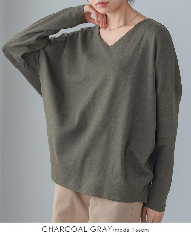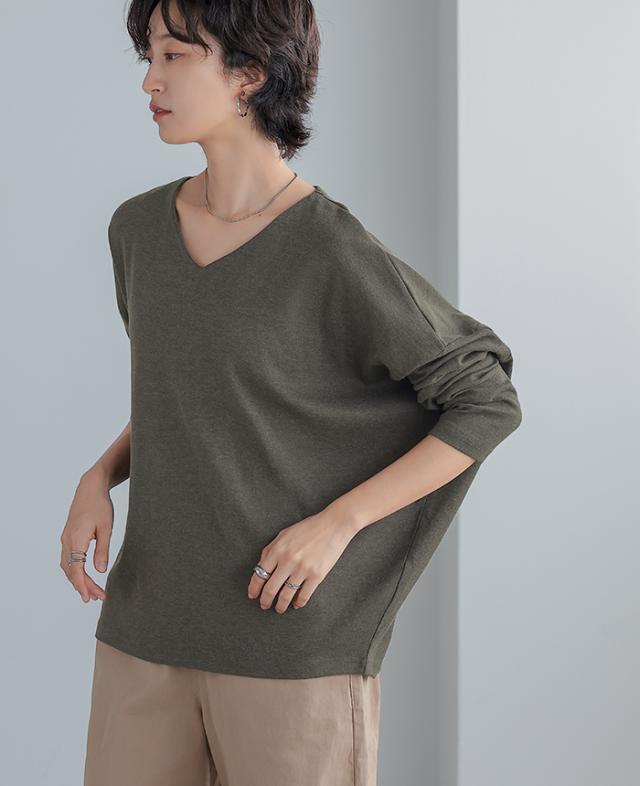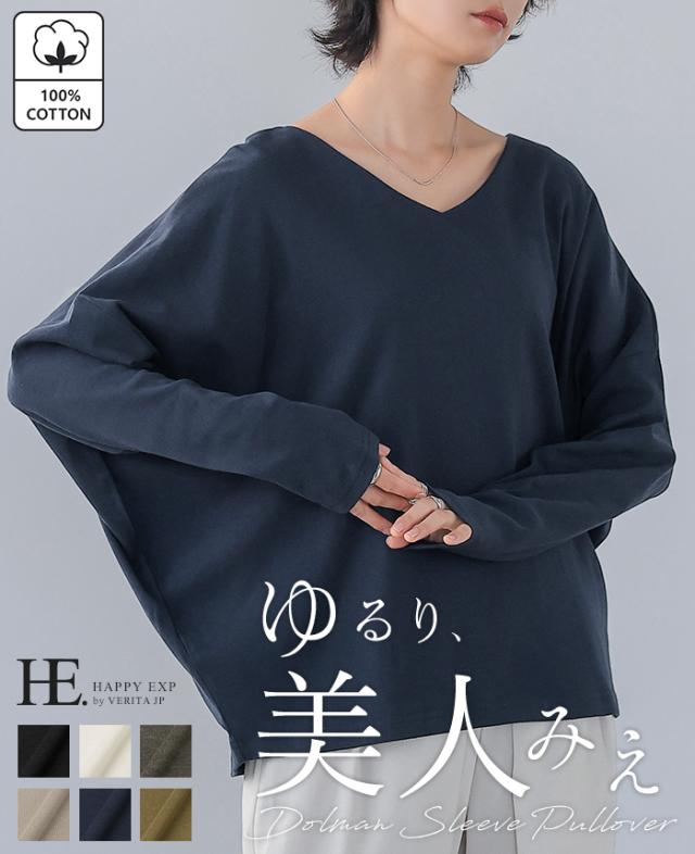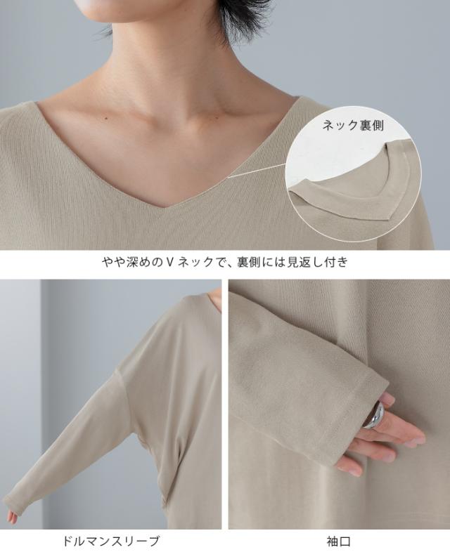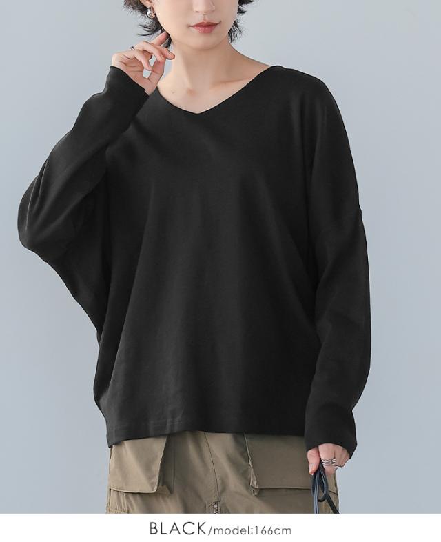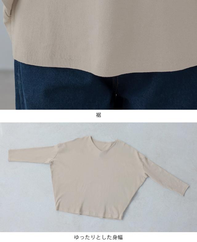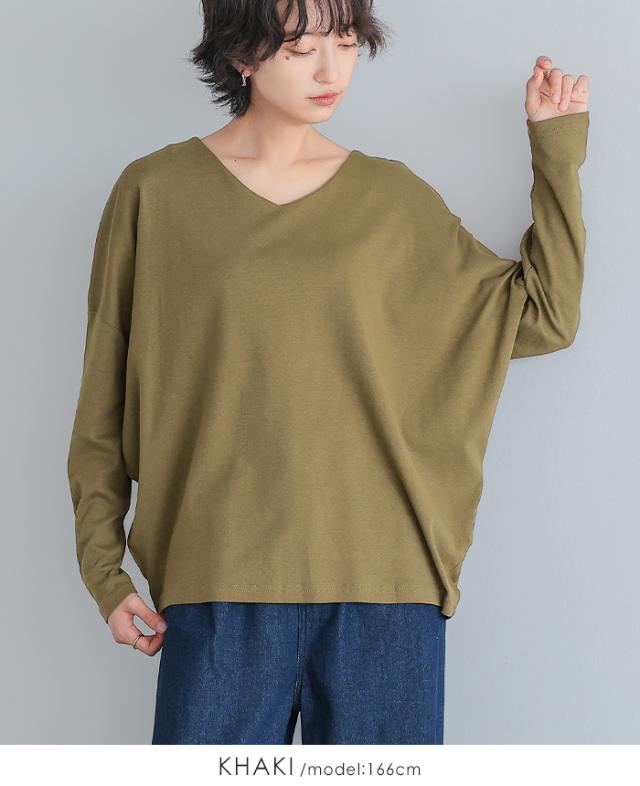 ドルマンスリーブVネックTシャツ レディース トップス Tシャツ ロンT 長袖 Vネック 無地 カットソー 綿100% ドルマン 体型カバー 秋冬 秋新作【メール便1点まで】[M便 1/1]