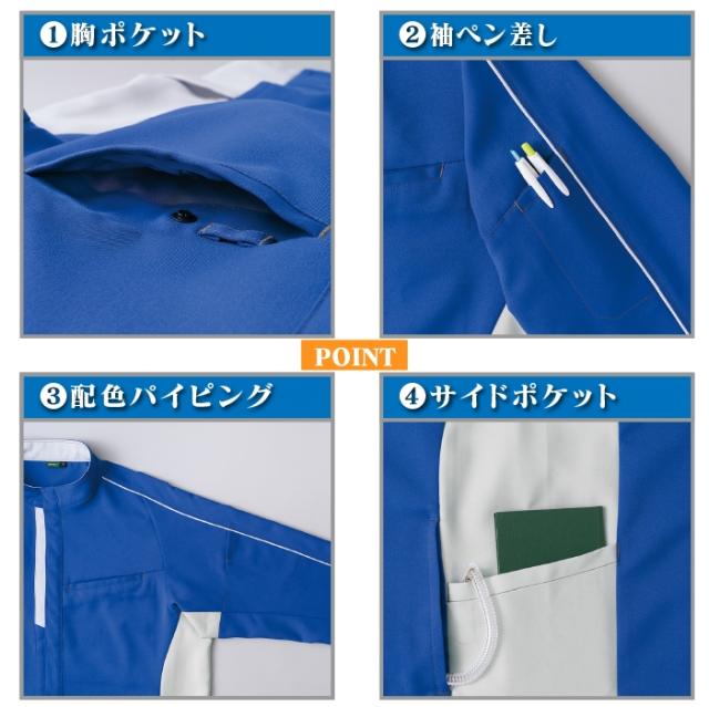 ◇機能:胸ポケット・袖ペン差し・IDハンガー・サイドポケット・サイドキーループ・配色パイピング・フロントドットボタン仕様