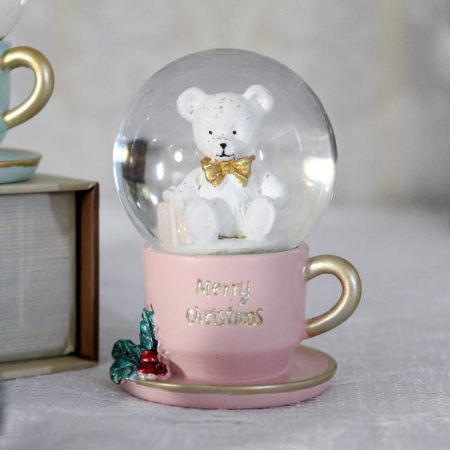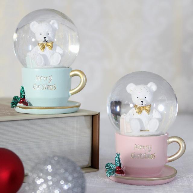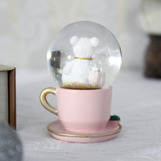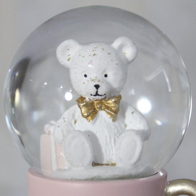 パステルカラーのティーカップにテディベアが入ったかわいいミニスノードームオブジェ。