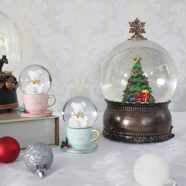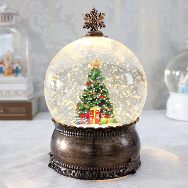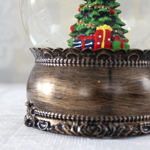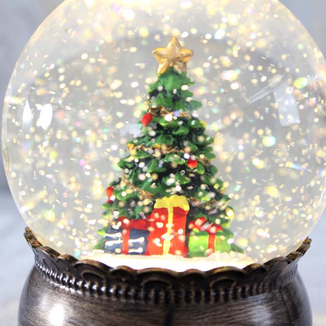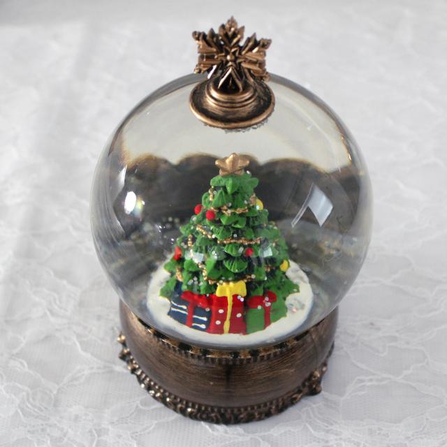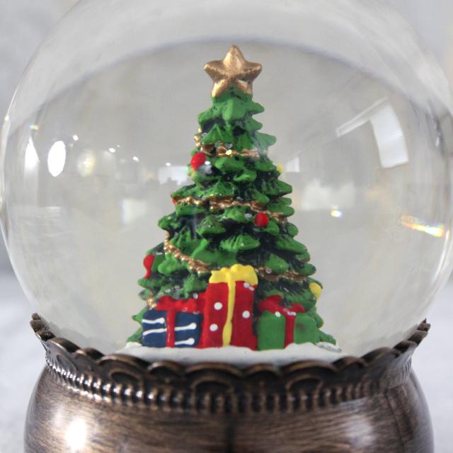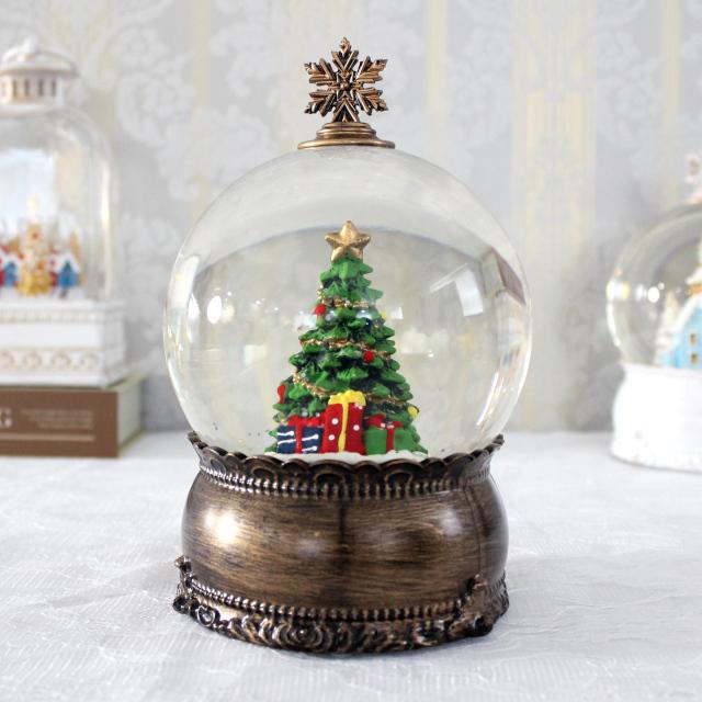 クラシカルなクリスマスツリーが入ったスノードームオブジェ。 |