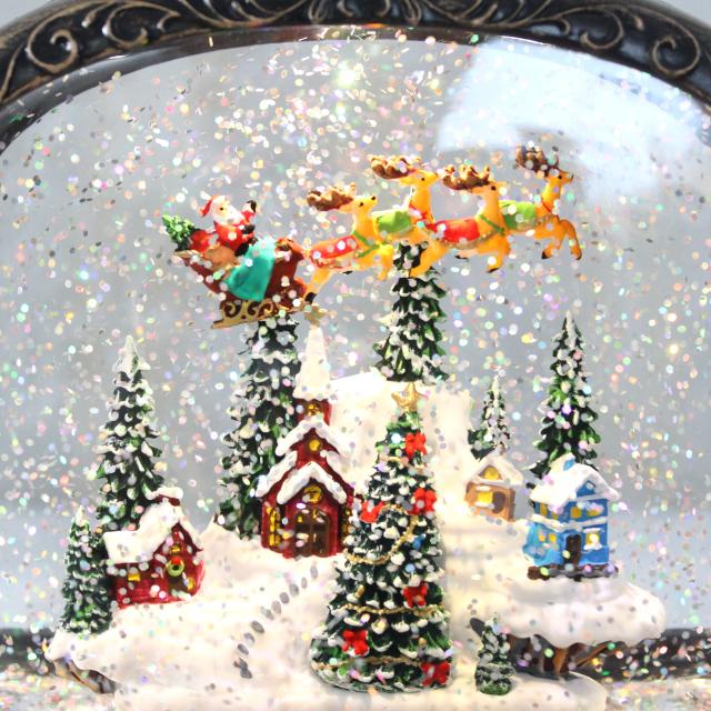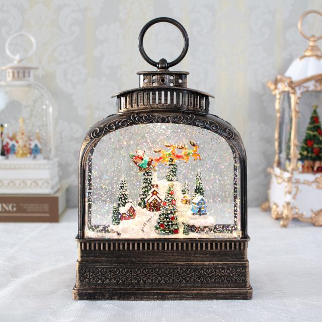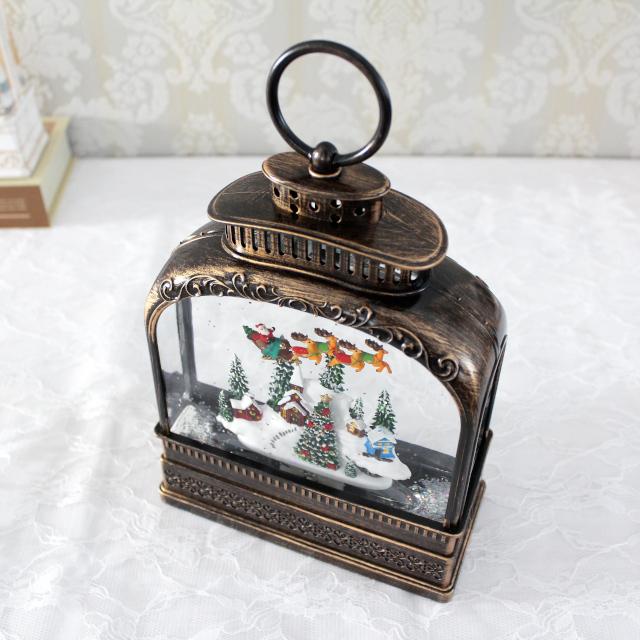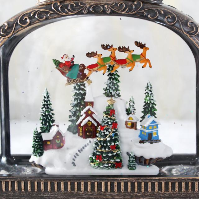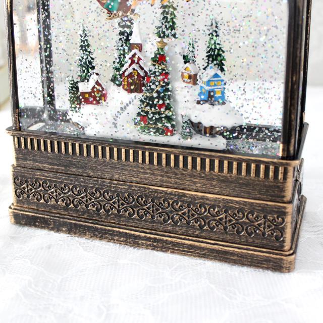 サンタクロースが空を駆ける街並みを再現したクラシカルなランタンのオブジェ。 |