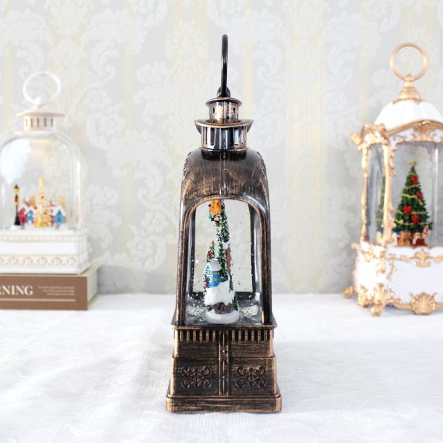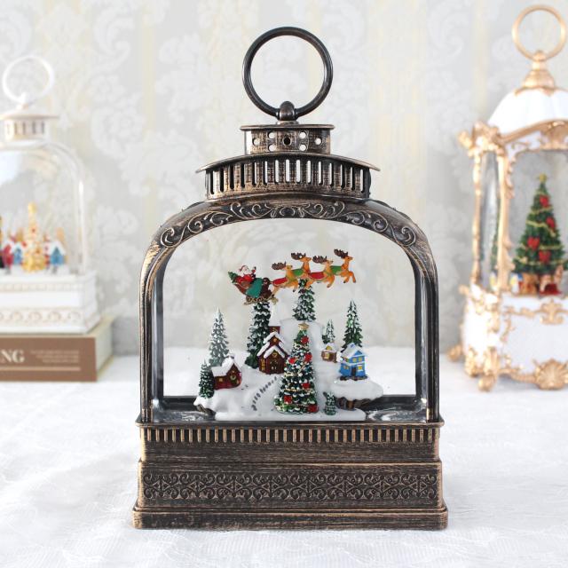 サンタクロースが空を駆ける街並みを再現したクラシカルなランタンのオブジェ。