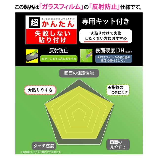 屋外や明るい場所でも画面が見やすく、指紋も目立ちにくい反射防止タイプのガラスフィルム。