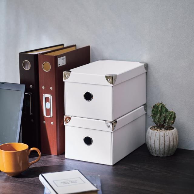 パルプ素材を使用した収納ボックスです。フタ付きでホコリを防ぎ、組み立ても簡単です。