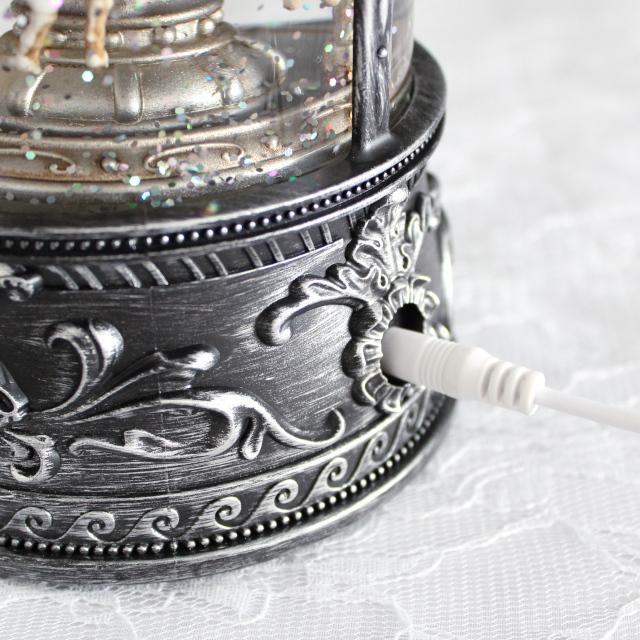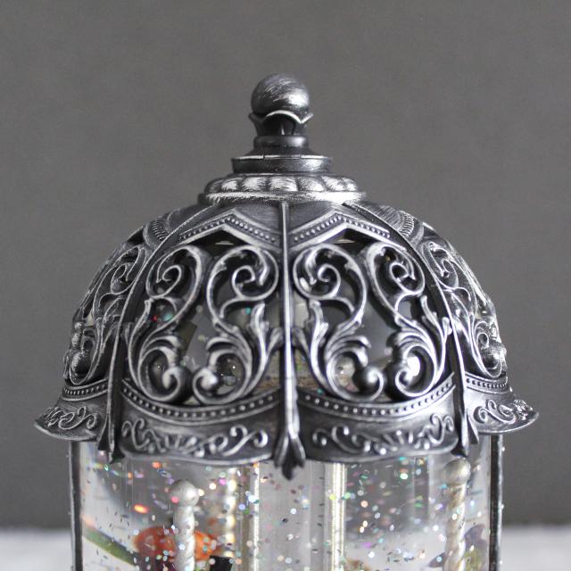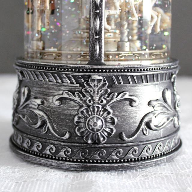スイッチを入れると光と共にラメが舞い上がり、水流に乗ってカルーセルが回ります。