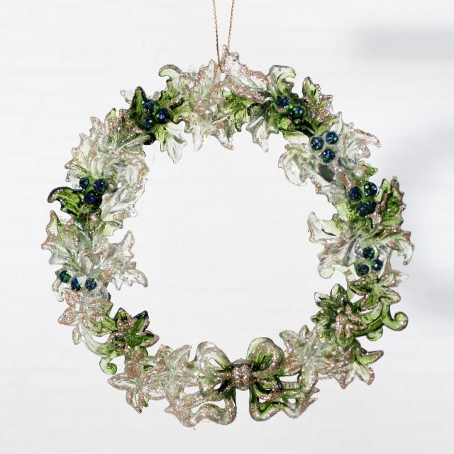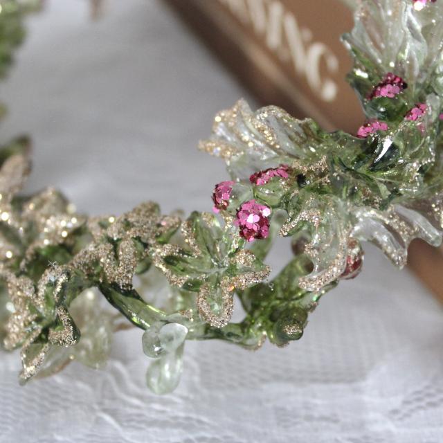 クリアグリーンのヒイラギにブルー・ピンクの実のアクセントをつけた、おしゃれなミニリースのオーナメント。