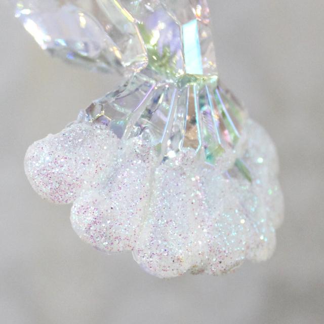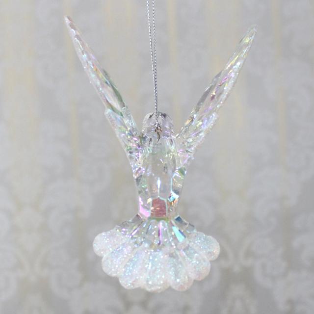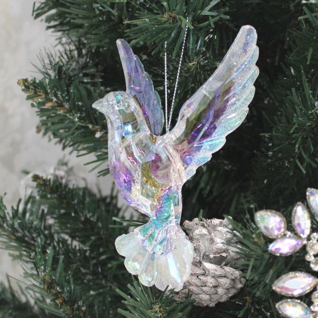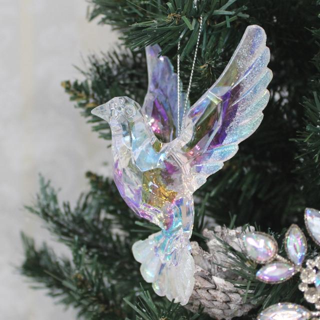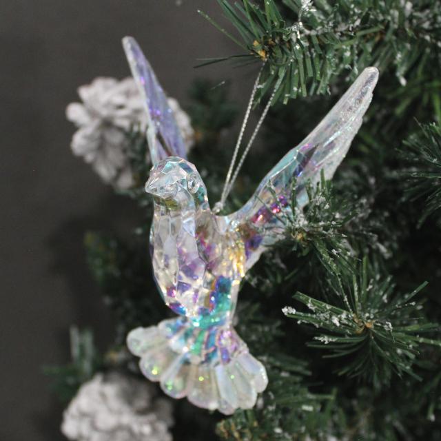 虹色に見えるロマンチックなアクリル製の鳥のクリスマスオーナメント。